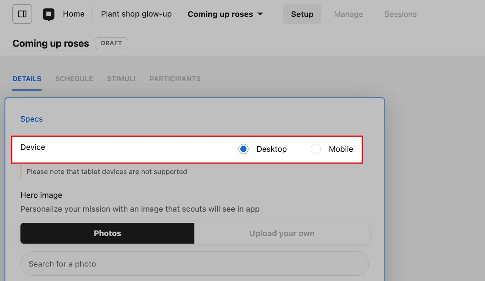 You’ll select your device type when you create a new interview study. However, you can change your selection prior to launch from the Setup tab of your study.