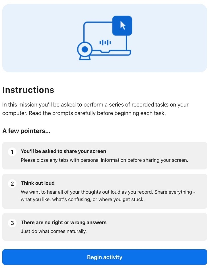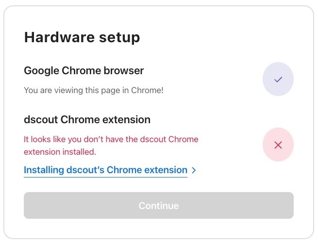 Note: If you chose not to require the Dscout Chrome extension for your study, this won’t show as a requirement for participants. For more information, see Manage participant experience in a usability test.