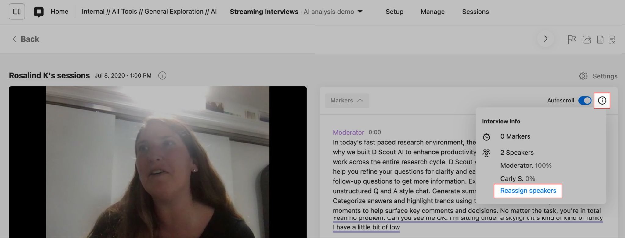 When uploading a session, Dscout automatically detects the moderator and participant and creates the session transcript accordingly. By default, the first person to speak in the uploaded session is labeled the moderator. However, you can update this manually if that is not correct.
