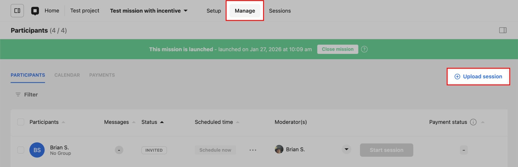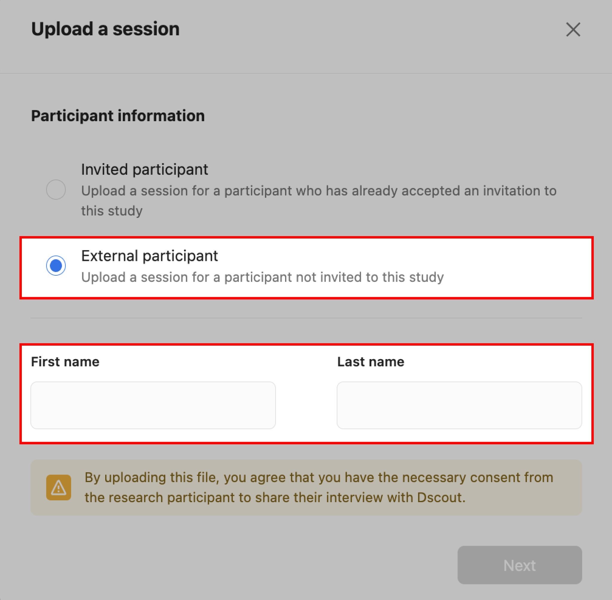 If you’ve conducted an interview with a participant not invited to your study directly, you can upload their session for easy analysis alongside your other sessions.