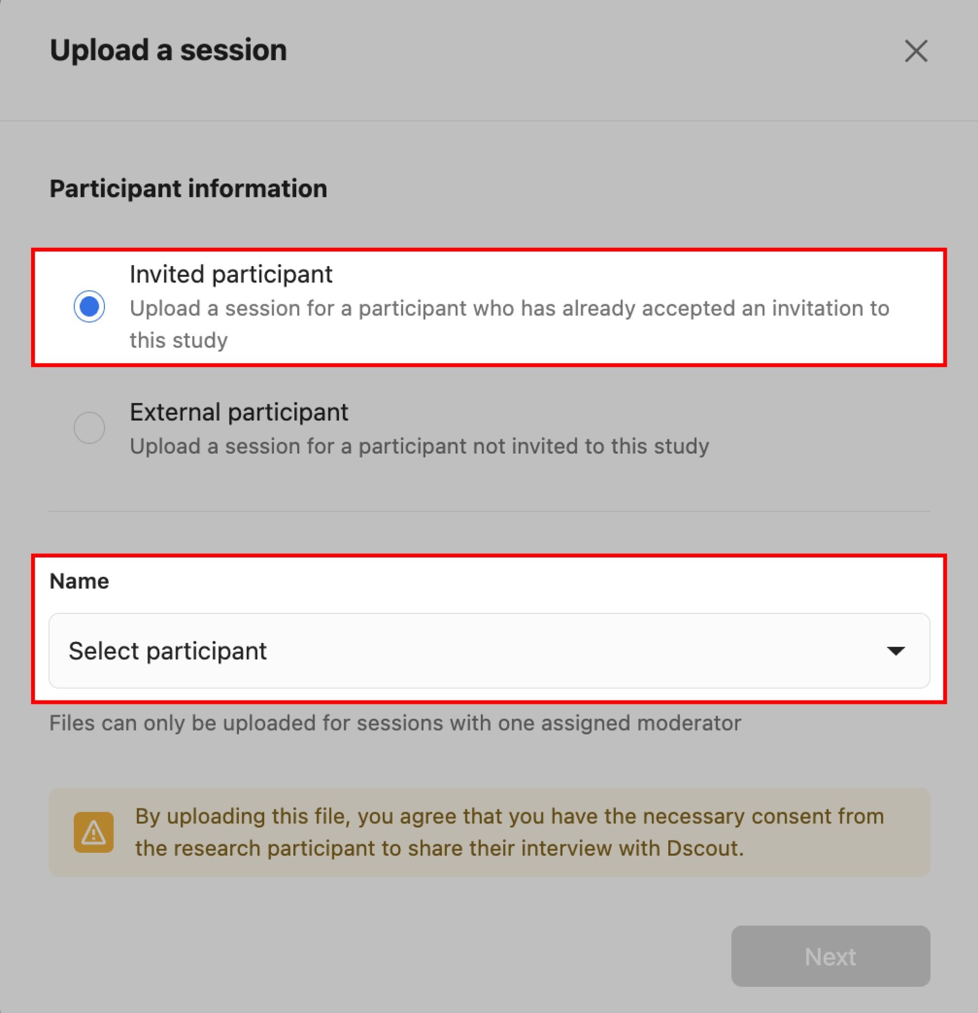 If you’ve invited a participant to your study but decide to conduct the interview session outside of Dscout, you can add the session recording to your study manually and link it to that participant for easy analysis.