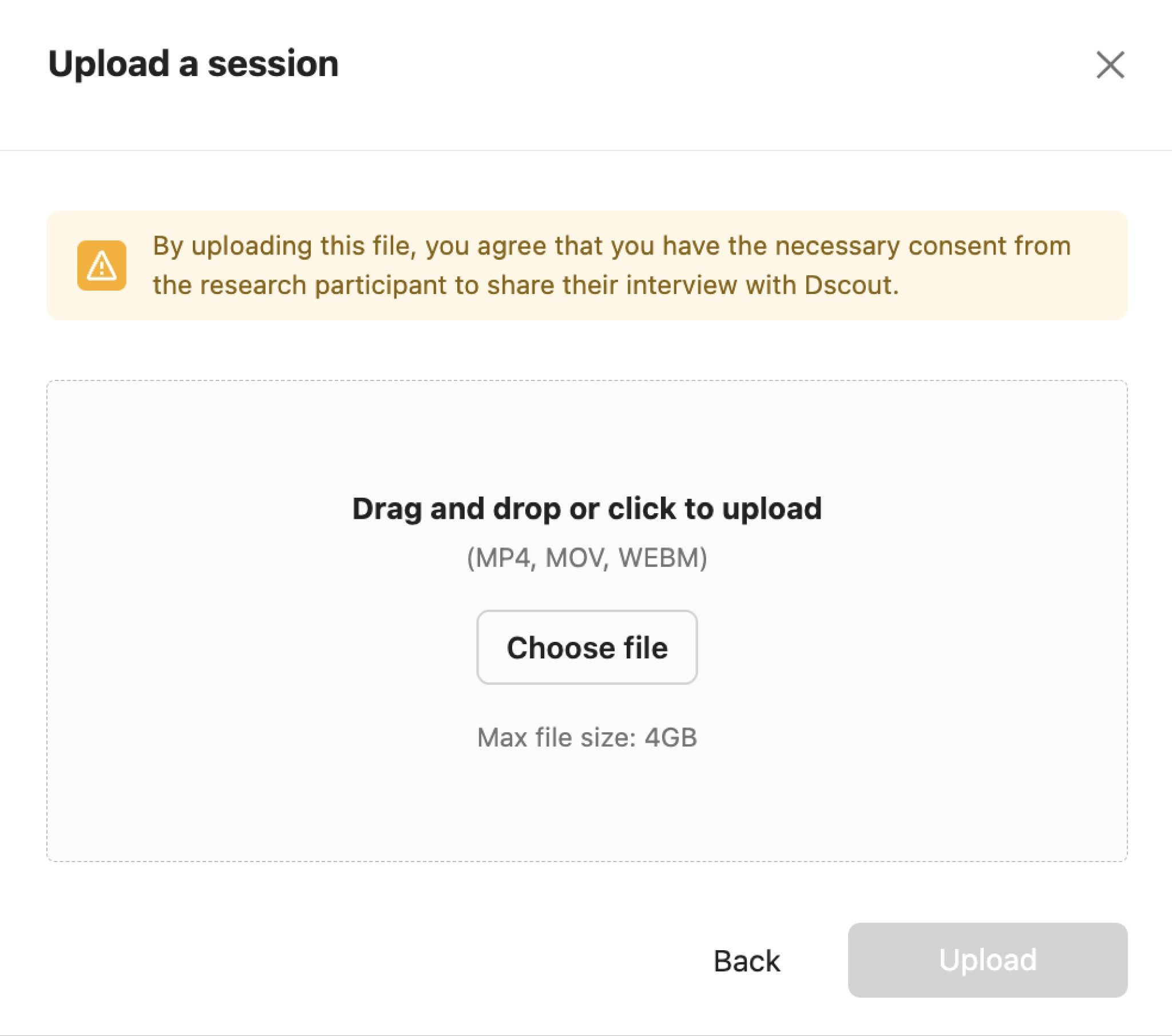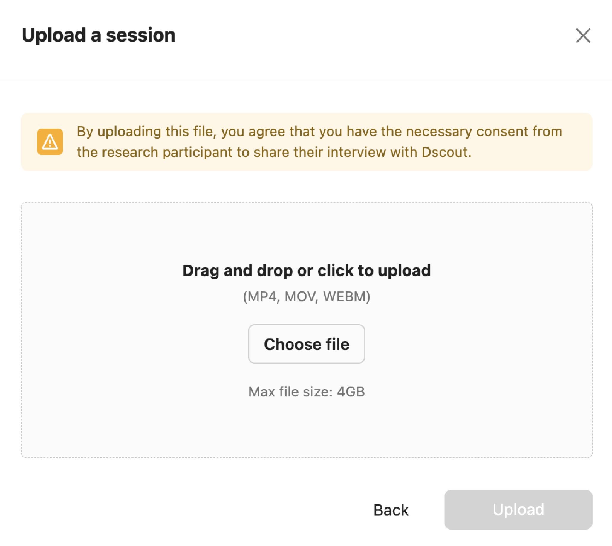 If you complete interview sessions outside of the Dscout platform, you can still upload them for inclusion in your Dscout interview study. This lets you manage studies all in one place even if sessions themselves might be completed using different tools, including Zoom.