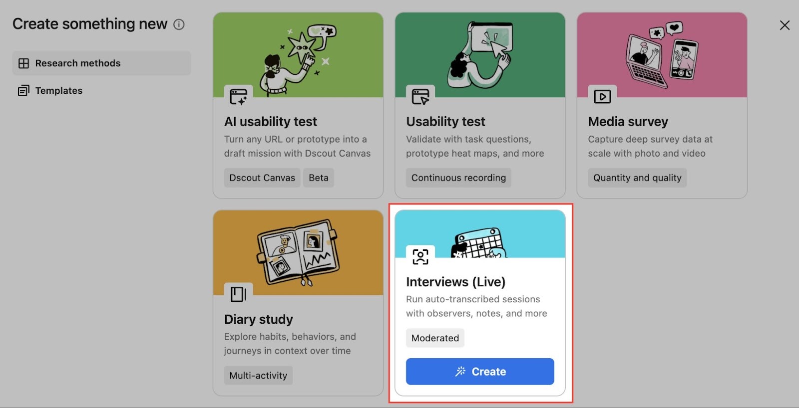 When you’re ready to create a new interview study, you’ll do so from within a Dscout project. If you plan to add participants from a Dscout screener, be sure to create your study in the same project that contains that screener.