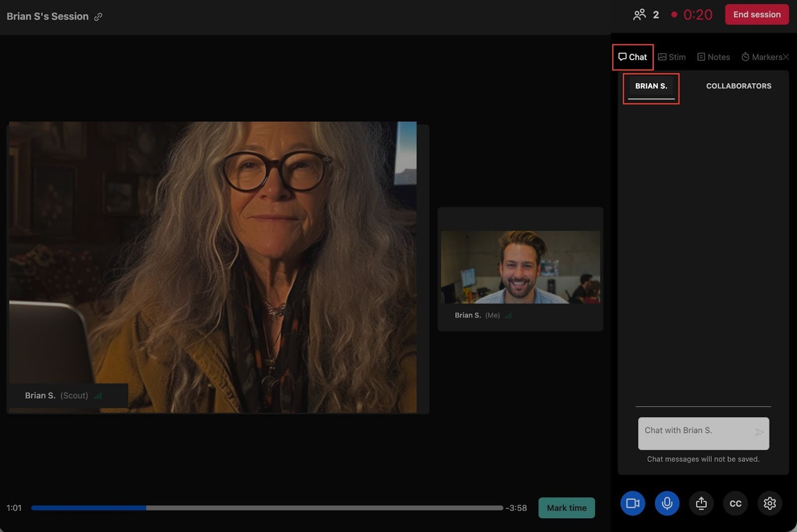 The bulk of an interview session takes place using the built-in video conferencing functionality. However, there may be some cases in which it’s useful to exchange text chats with your participants or collaborators. For that, Dscout offers an in-session chat for live interviews.