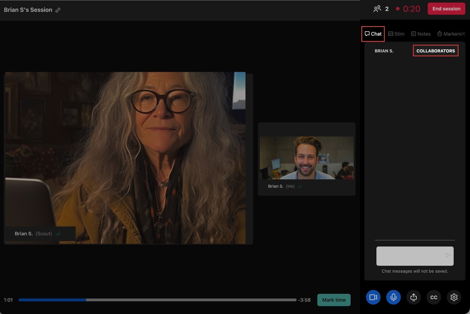 If you’ve invited observers to a session—or if you’re an observer yourself—you can chat with your collaborators (the moderator and other observers) during the session. Chats sent to collaborators are not visible to the participant.