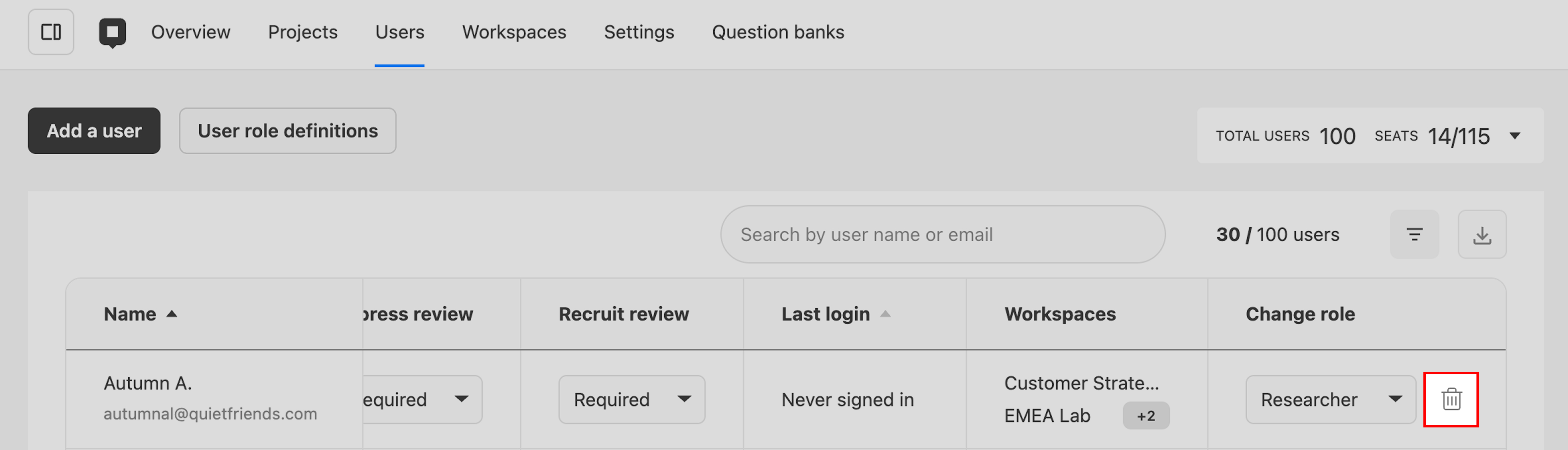 To remove a user, click the Remove user (trash) icon in that user's row, then click Yes in the confirmation modal: