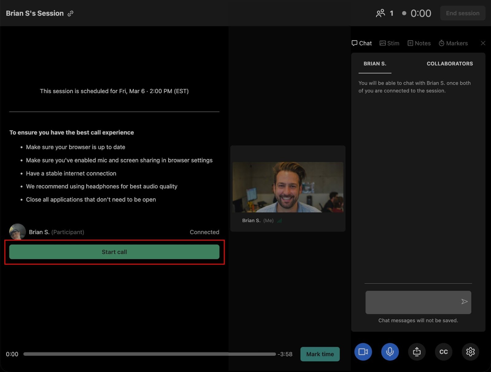 Now, you’ve joined the session as a guest. When the moderator begins the call on their end, you’ll be able to watch and listen in without the participant knowing you’re there. You can leave the session at any time by clicking Exit session in the top right corner.