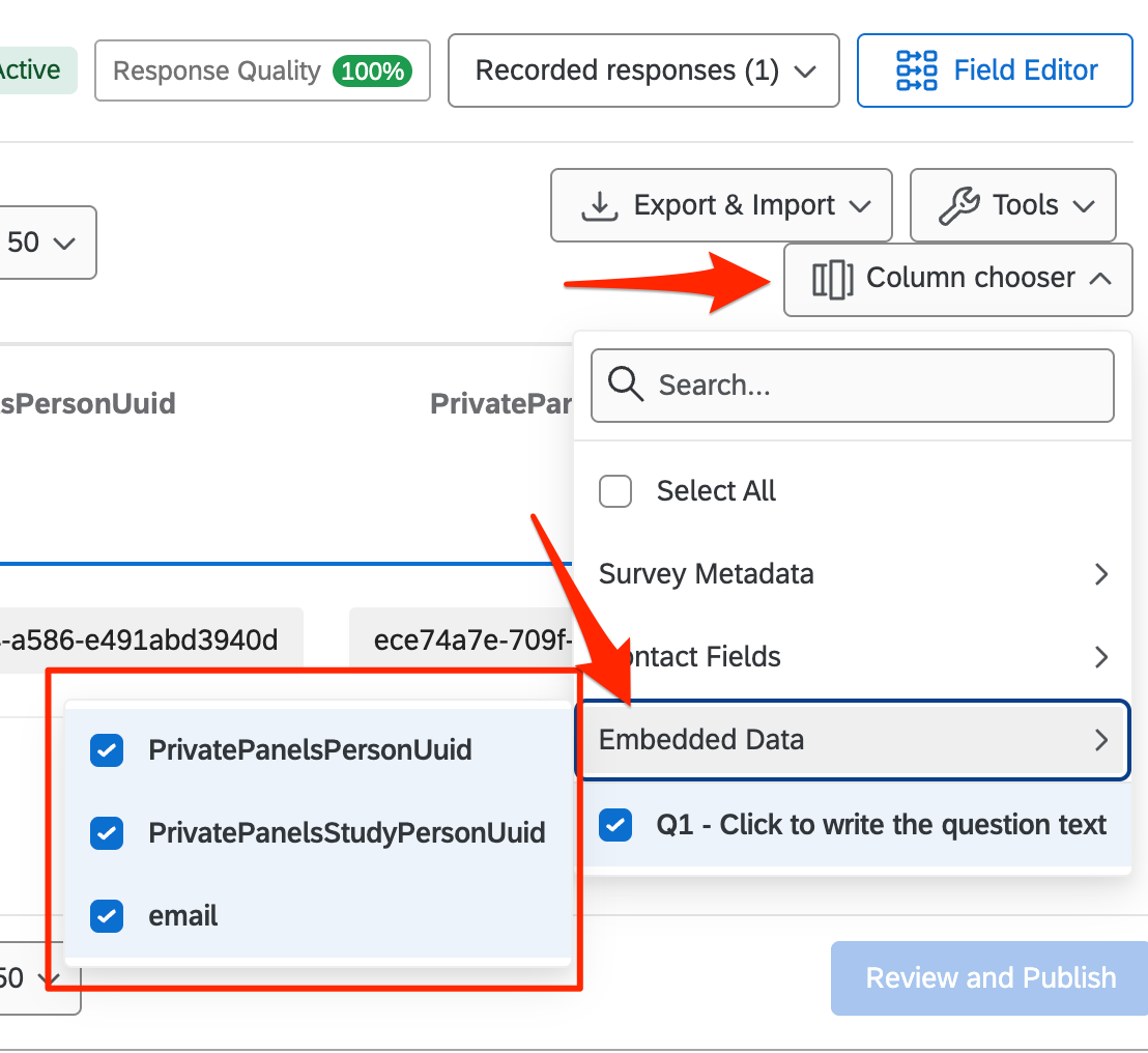 To display the shared data in Qualtrics, click Column chooser, select Embedded Data, then select which properties you want to display: