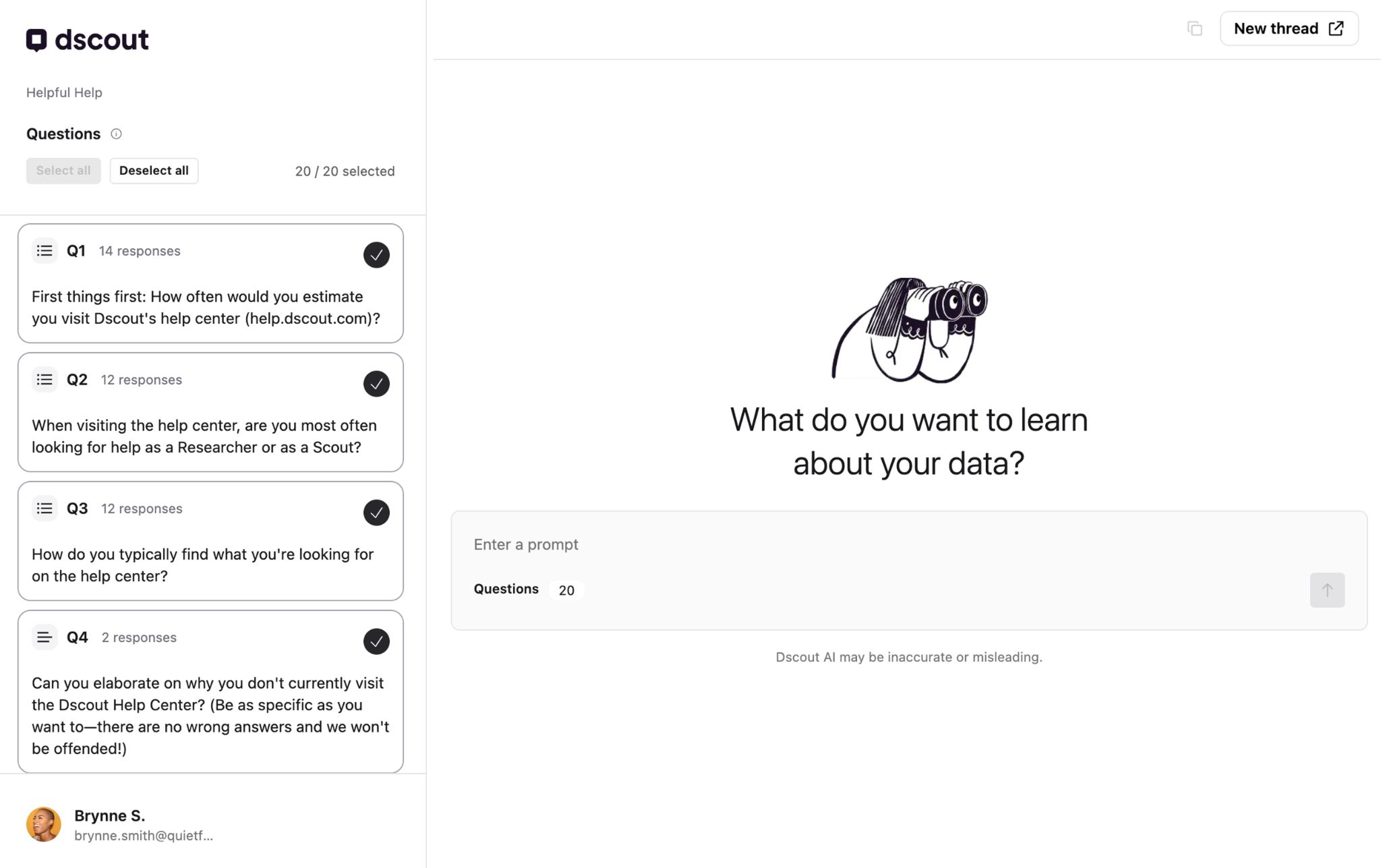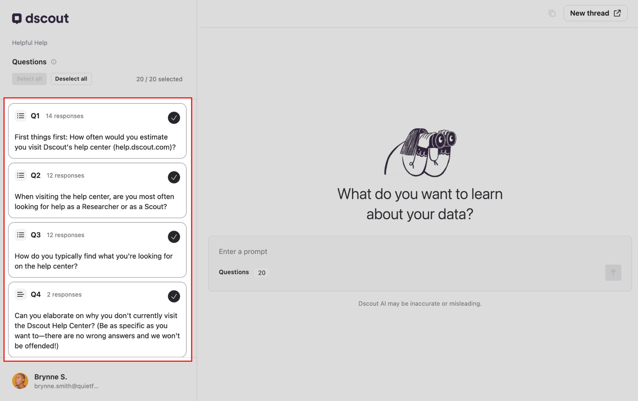 Each question from your study is listed in the left sidebar. All questions are selected by default at the start of your session, but you can select or deselect specific questions here to have Dscout AI only focus on those.
