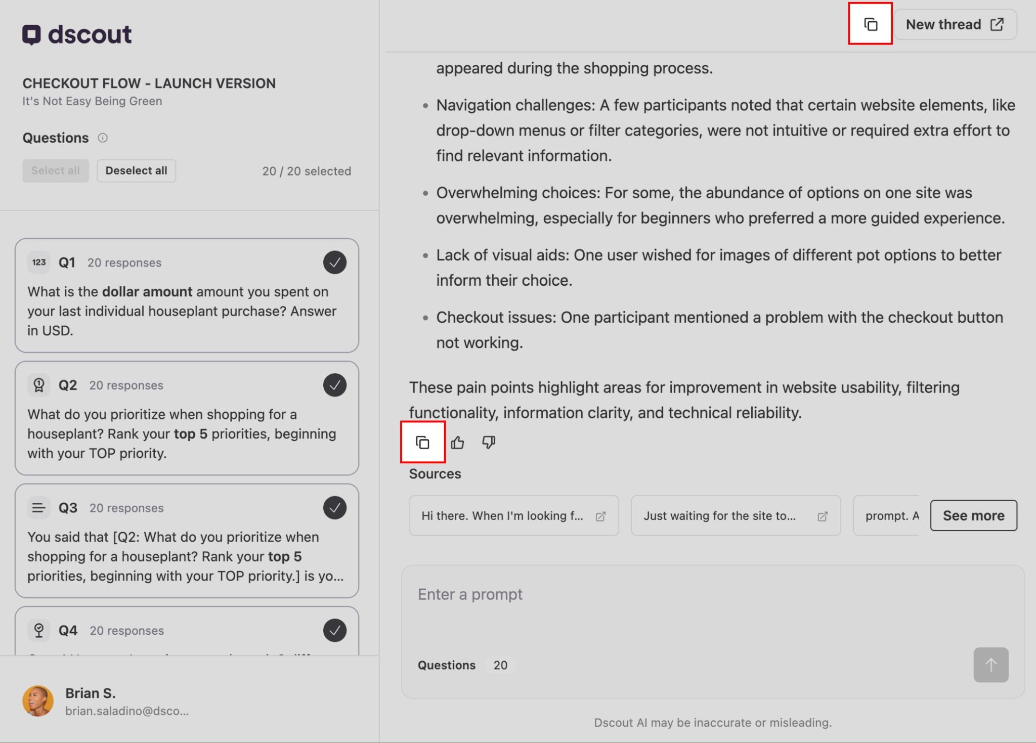 If you want to share one (or all) of Dscout AI’s responses from a chat session, you can copy them to your clipboard. Click the Copy button at the top of the chat window to copy your entire thread. Or, click the Copy button beneath an individual response to copy just that response.