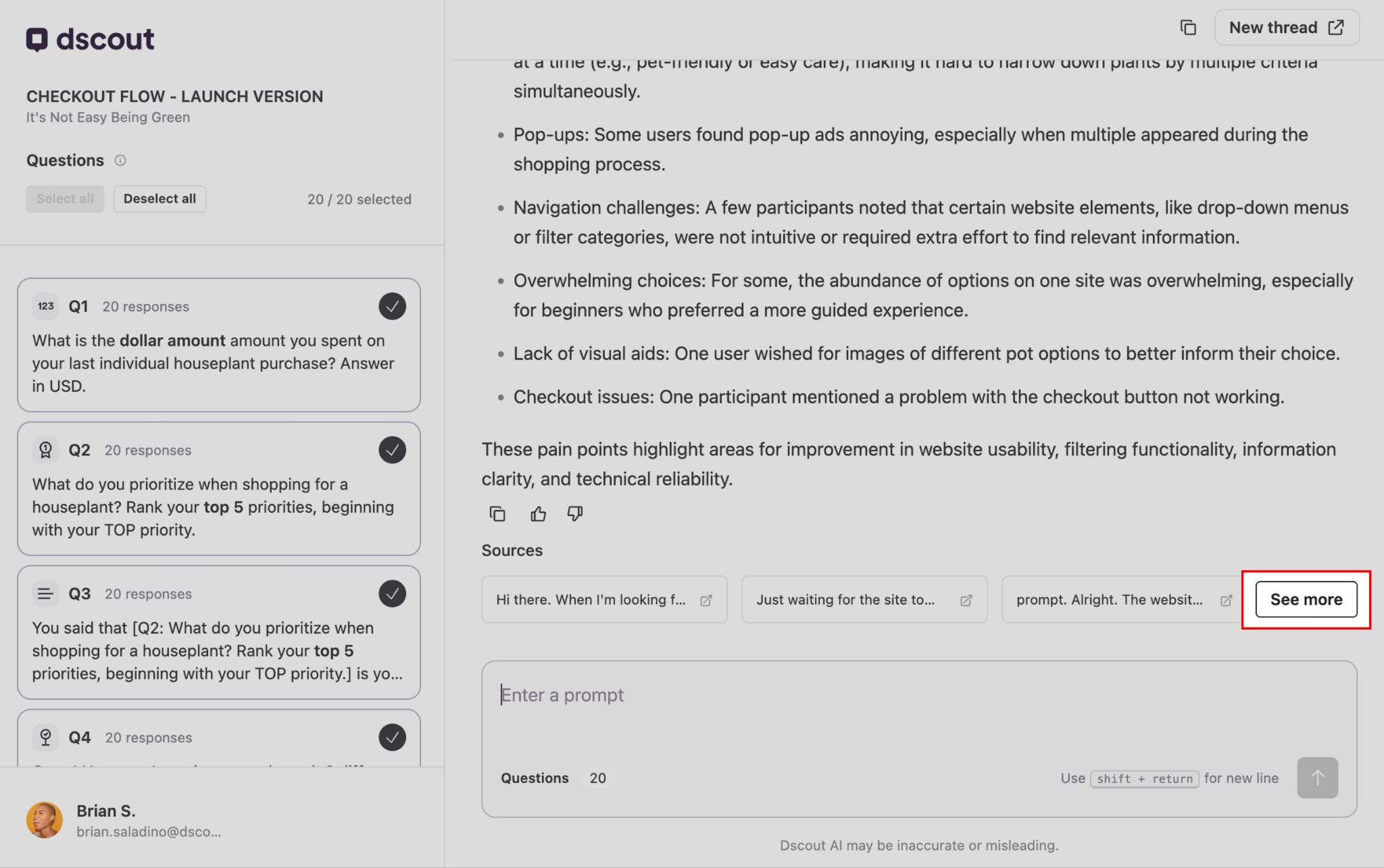 - Click See more beneath the response from Dscout AI. A list of sources is displayed.