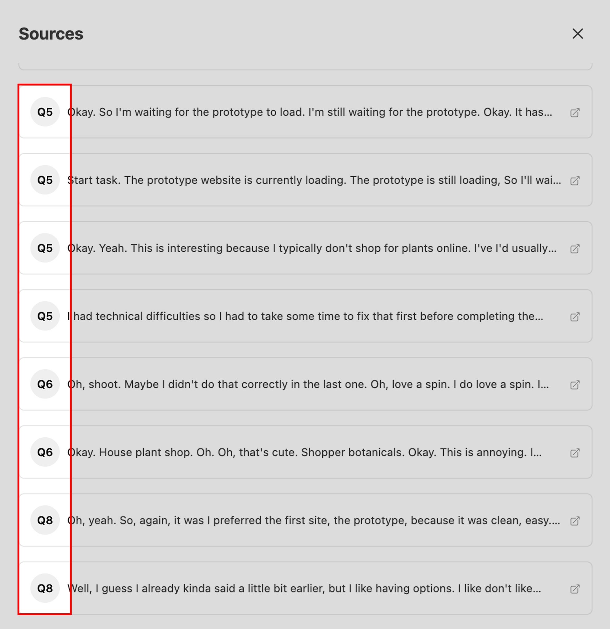 Here, you can view the full context Dscout AI pulled from to provide its response. Dive deeper into what your participants had to say to uncover additional insights.