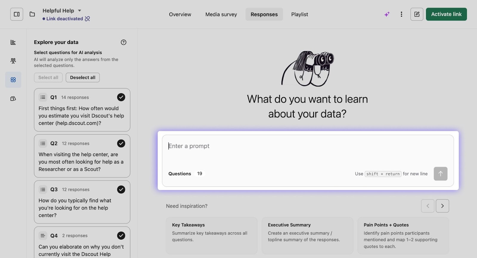 When exploring your data with Dscout AI, you’re in total control. That means you can tell it exactly which questions or sessions to reference when responding to your prompts.