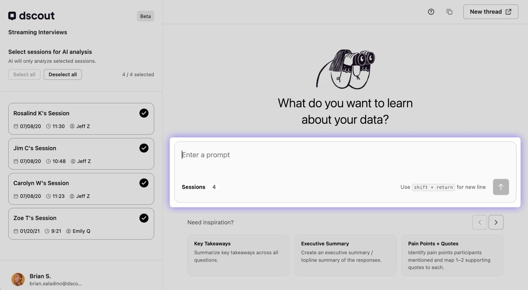 To explore different ideas and themes in your data, use the New thread button in the top right corner to start a fresh chat with Dscout AI.