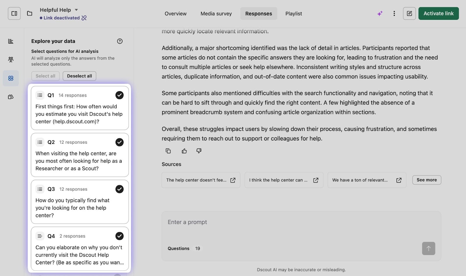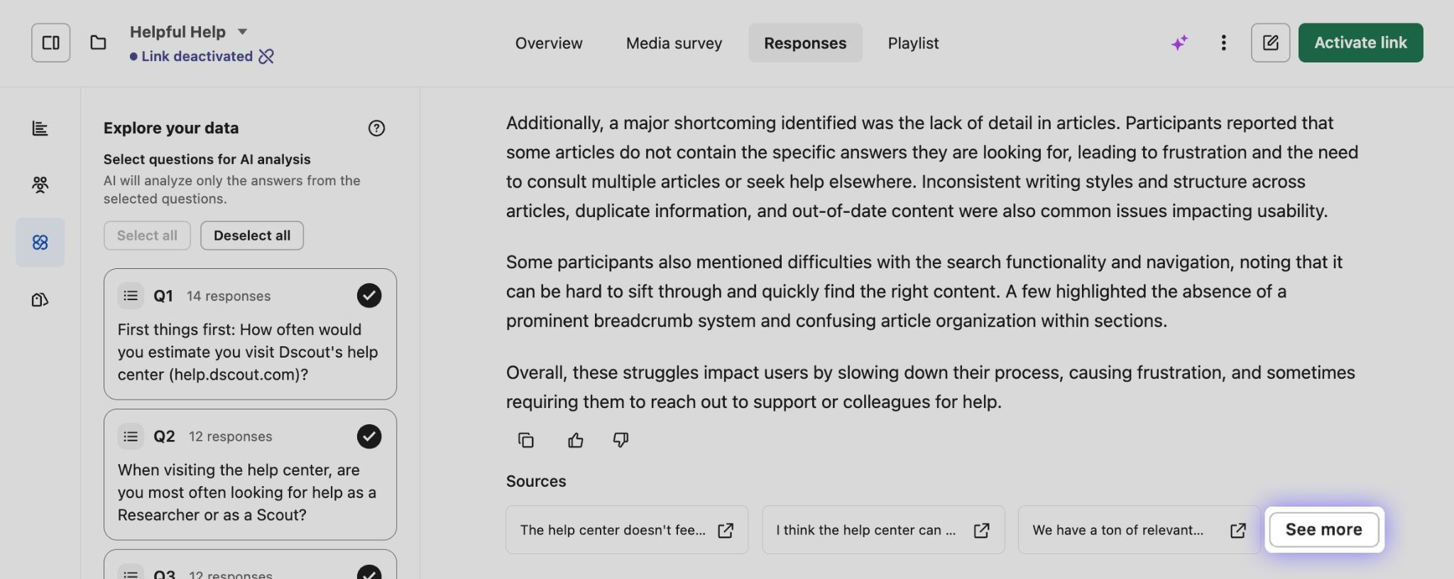 To review response sources, click See more beneath the response from Dscout AI: