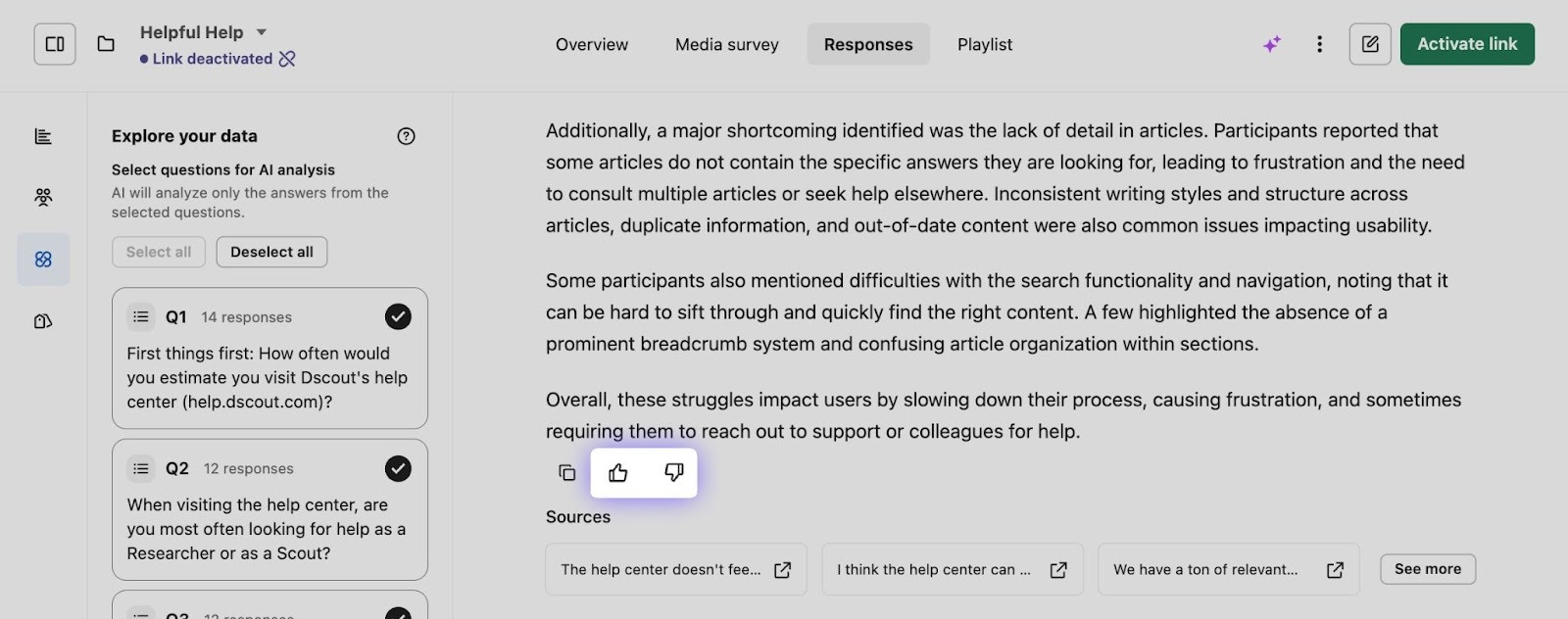 When Dscout AI provides a response, it will cite its sources so you can take a closer look at where the data came from. Sources lead directly to individual participant responses or sessions so you can see the larger context.