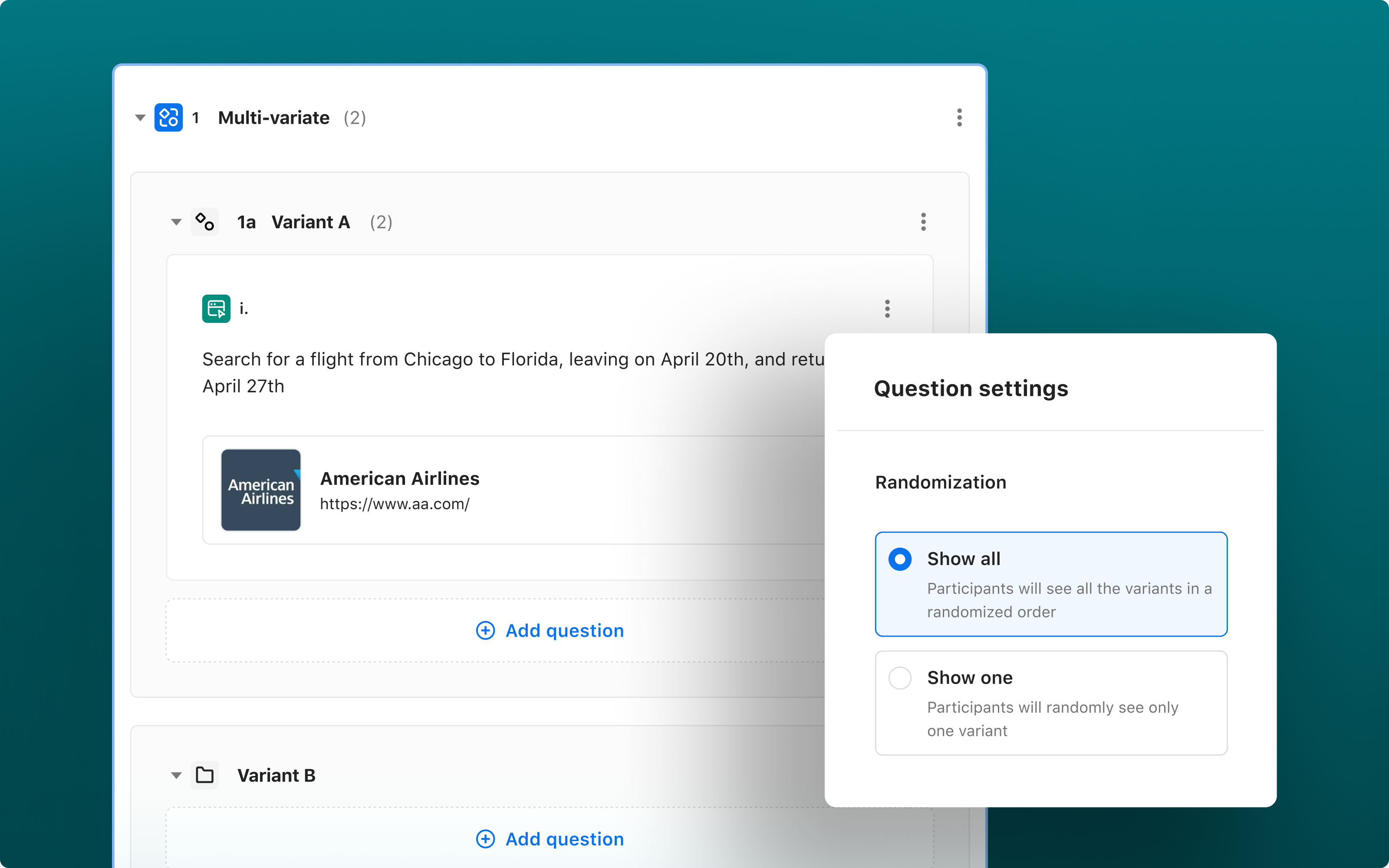 No more juggling multiple media surveys or usability tests—now you can test up to three variants in a single mission. Create variant groups with different tasks, questions, or content, and participants will be randomized automatically. With multi-variate testing, you can: