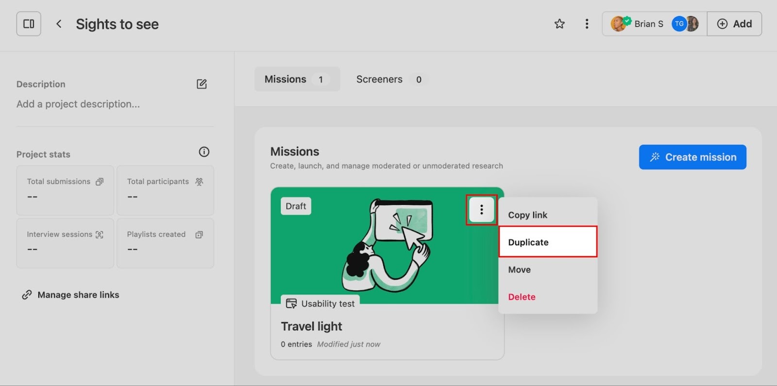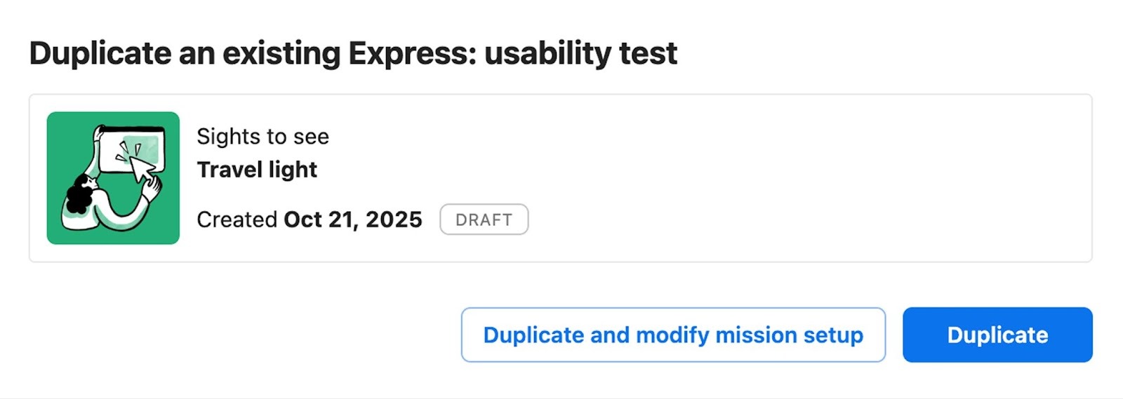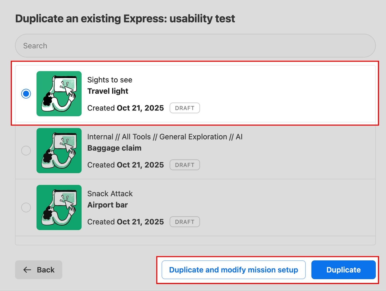If you have an existing usability test you want to use as a starting point for a new mission, you can duplicate it. There are two ways to duplicate a mission: either by first locating the mission itself or by searching for it from the Create something new modal.