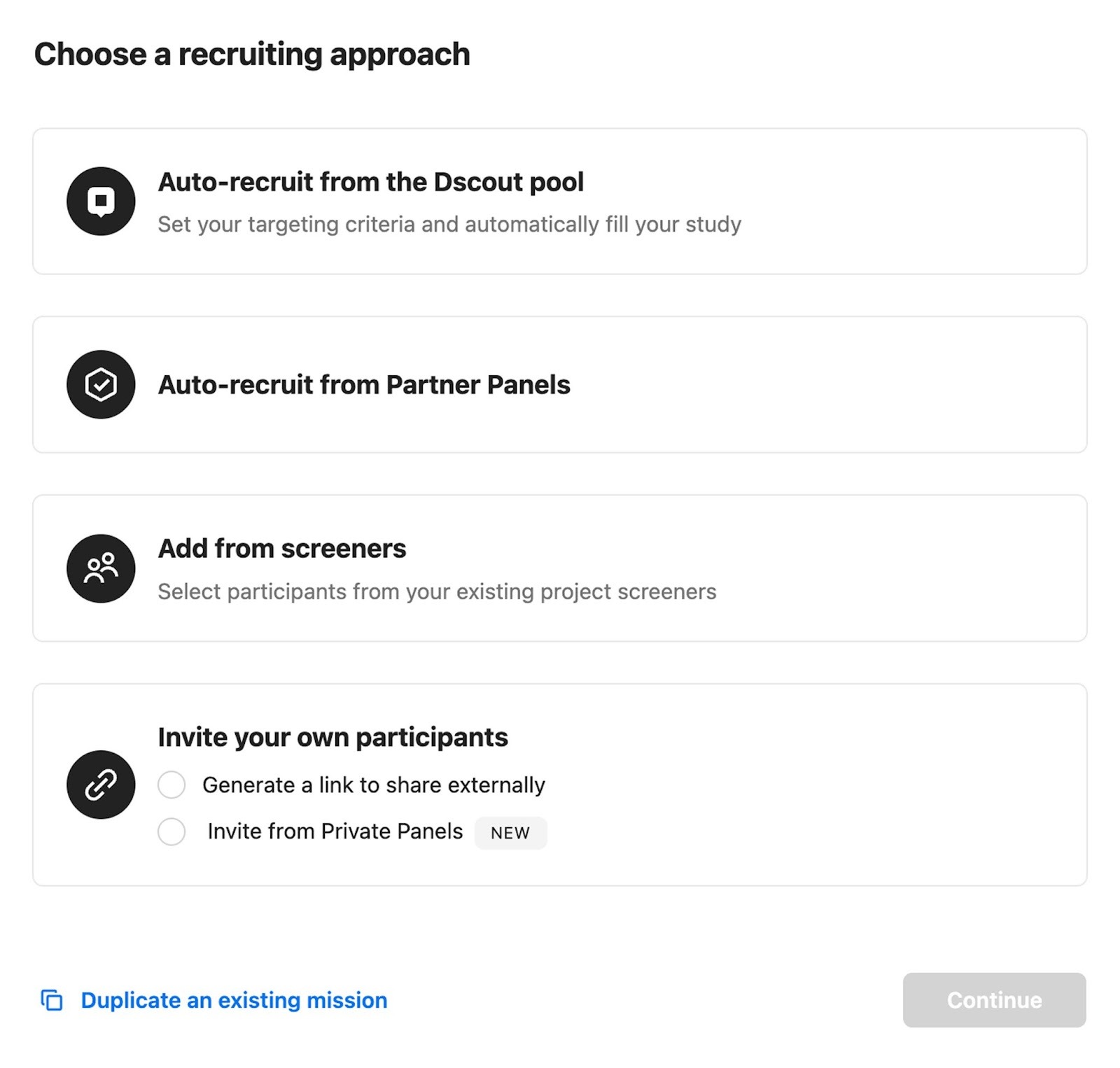 - Duplicate: Copies the mission exactly as-is, including recruitment approach, device type, and recording option.