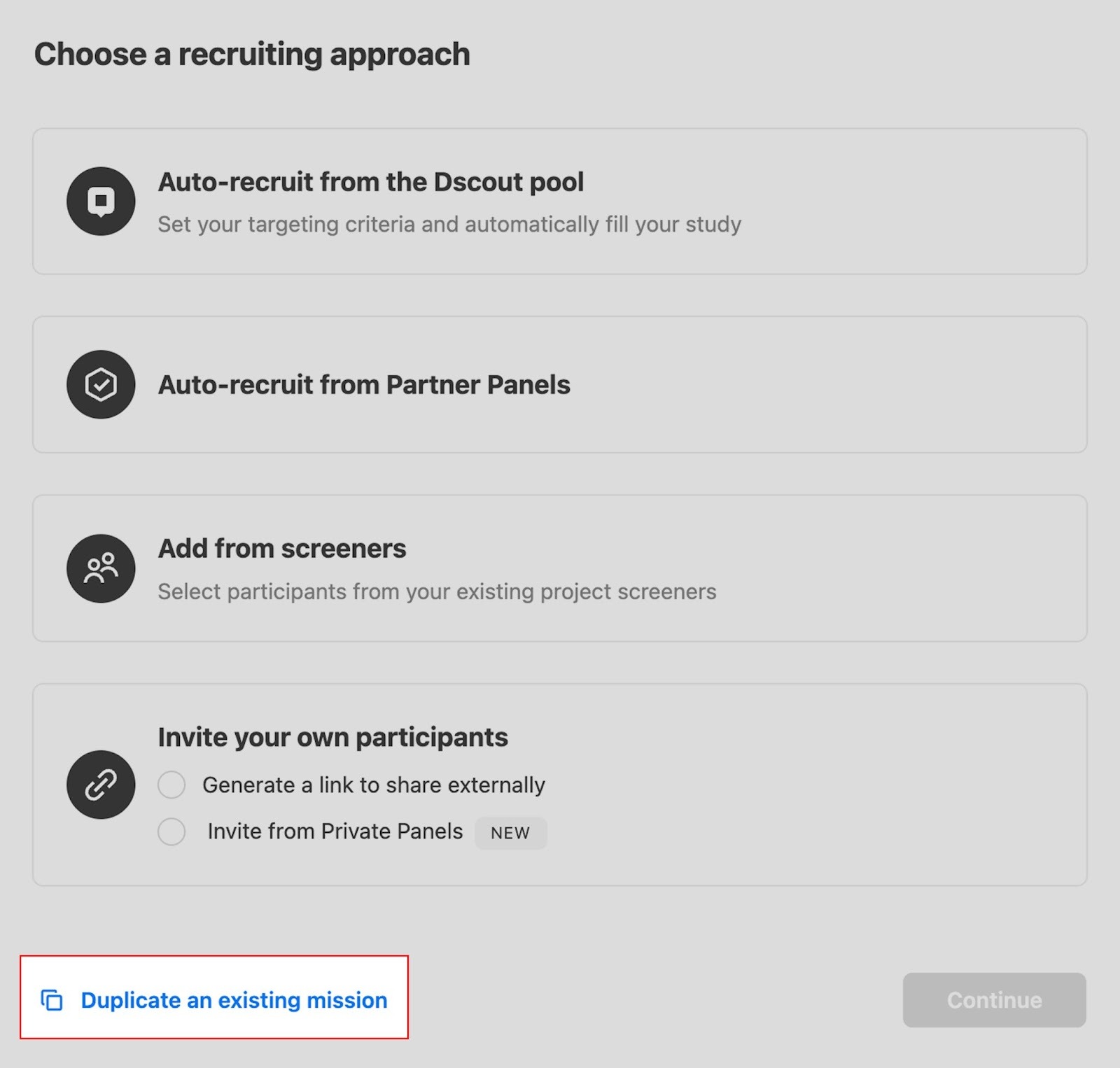 - Duplicate and modify mission setup: Copies the mission’s questions but allows you to modify recruitment approach, device type, and recording options.