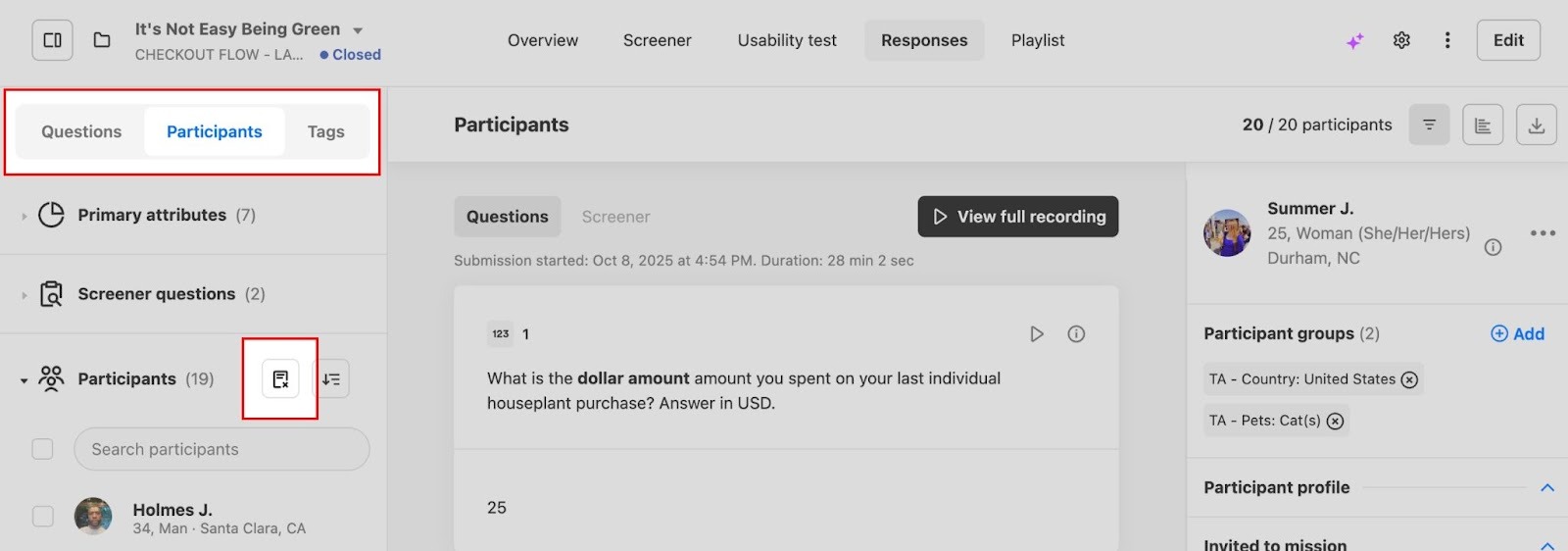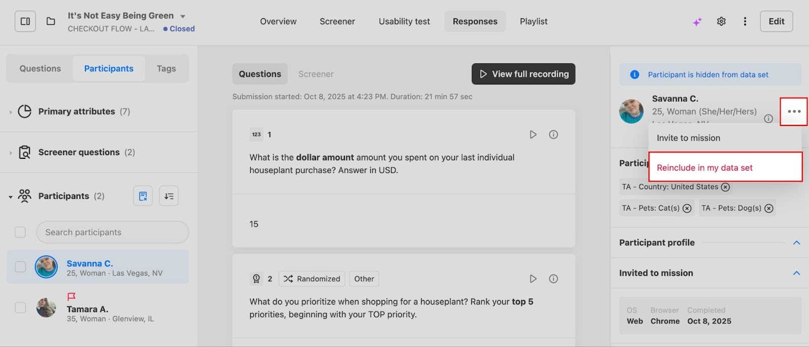 Now, the selected response is once again included in your study. You’ll see it alongside the other responses, both in the Questions view and the Participants view. The response will also be included in any data you export from your study going forward.