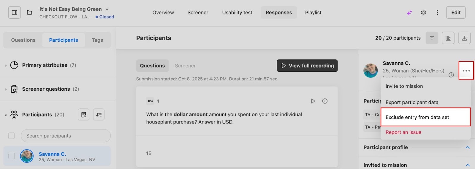 - Select the participant whose response you want to exclude. The participant’s details are displayed in the right sidebar.