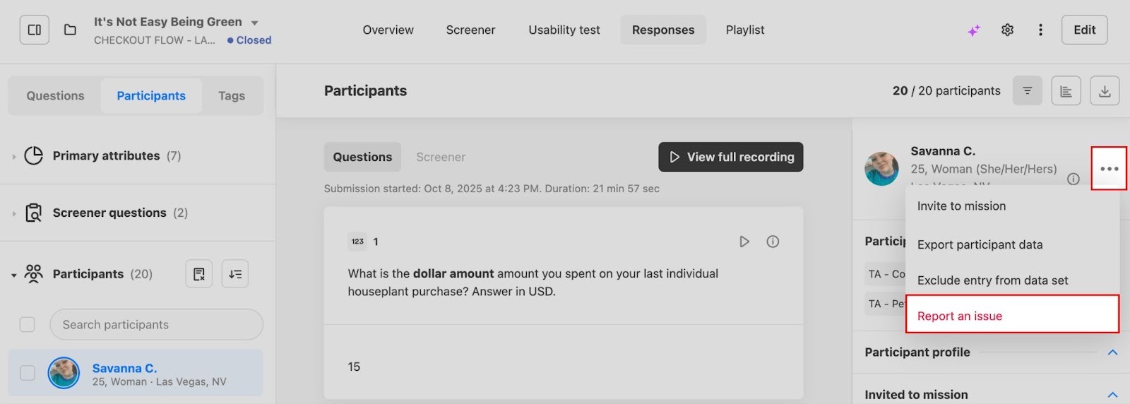 Dscout takes pride in the quality of our Scout Panel and our Partner Panels. So, we want to hear from you if you have concerns about the quality, honesty, or integrity of a participant’s response. You can report any concerns directly from your study.