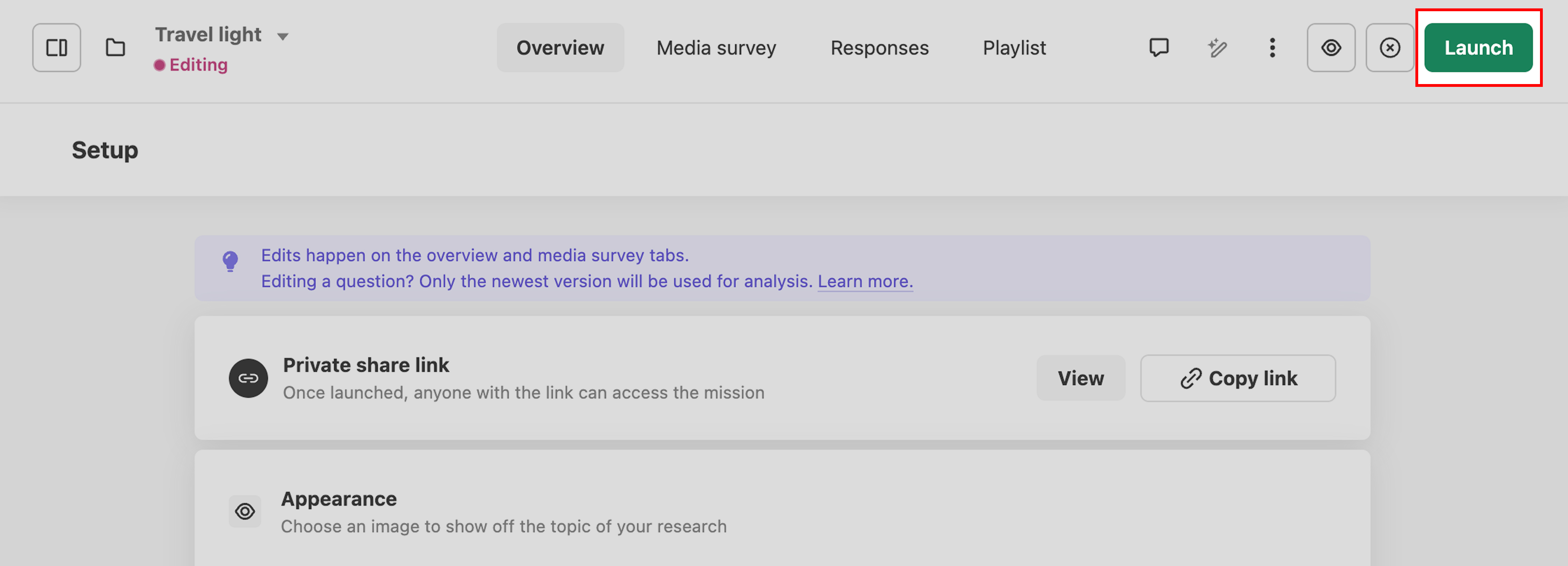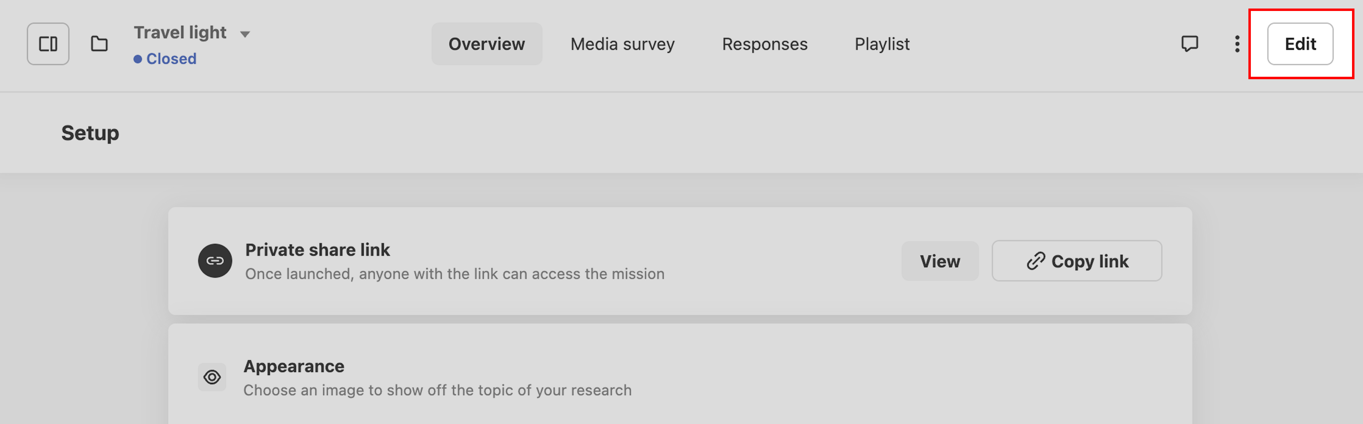 If you chose to invite your own participants as your mission’s recruitment method, you’ll need to share the link with them so they can access it. You can find your mission’s link at any time on the Overview tab of your mission: