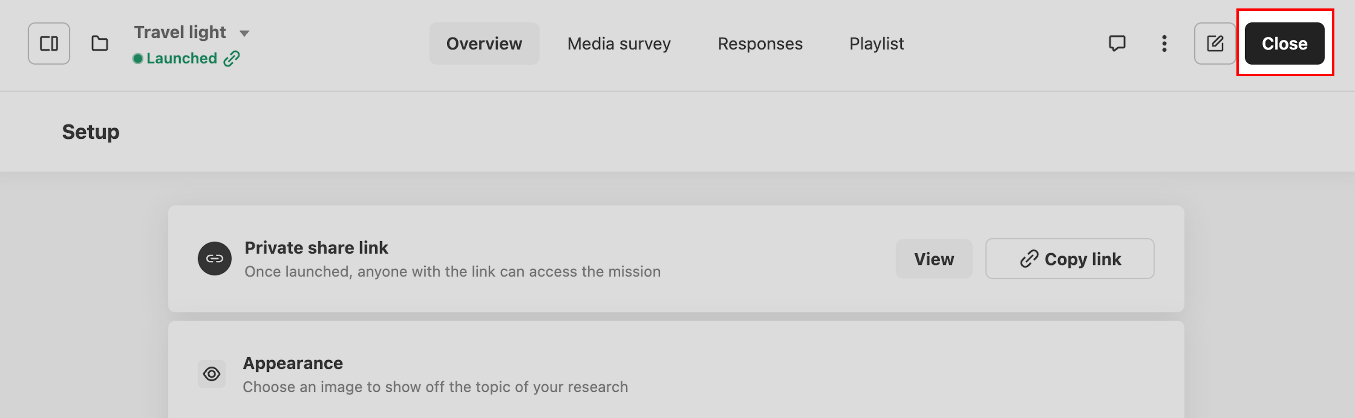 When inviting your own participants to a study, closing your study deactivates the share link. This prevents any new participants from joining using that link. However, you can reactivate the share link if you want to hear from more participants in the future.