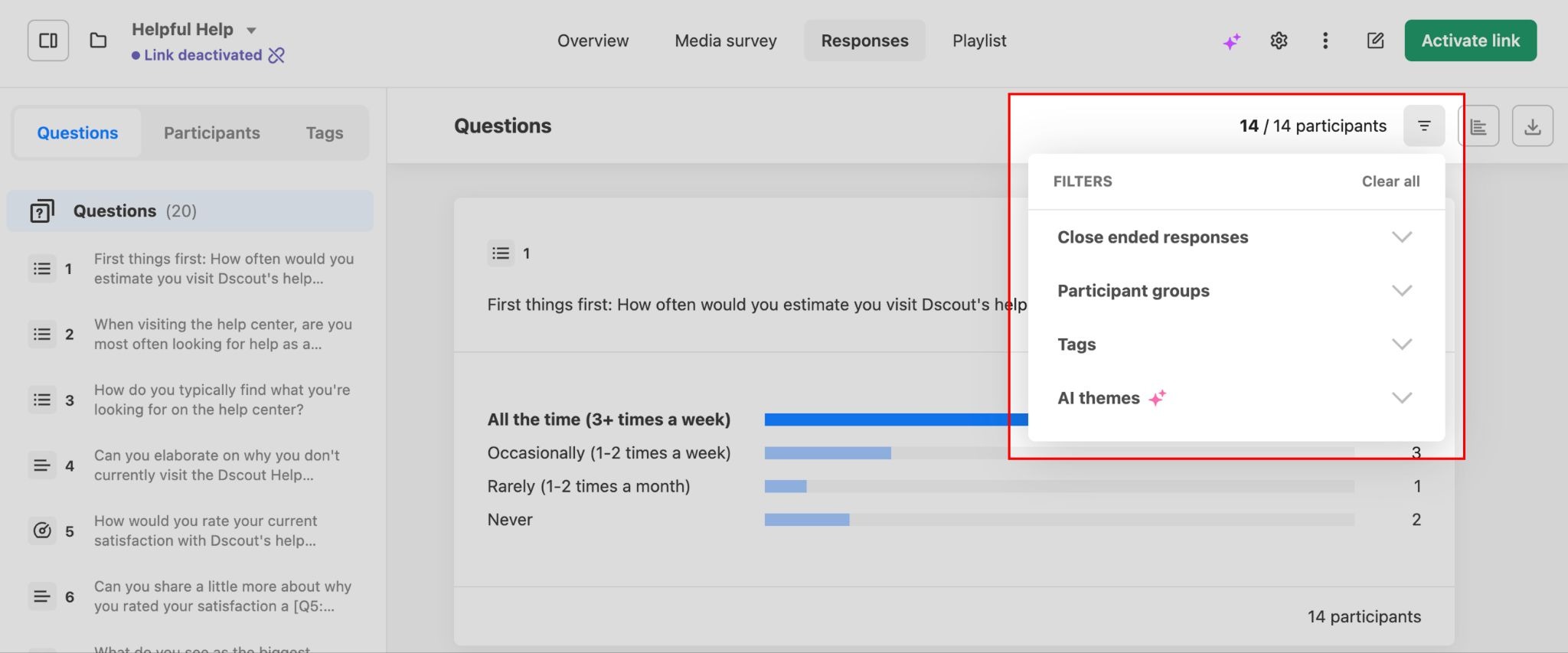Across all views of the Responses tab, you can filter the data that’s displayed. For example, you can filter the data to only show responses from participants who made a particular selection from a given multiple choice question. Or, you can filter by participant attributes like age, gender, and more.
