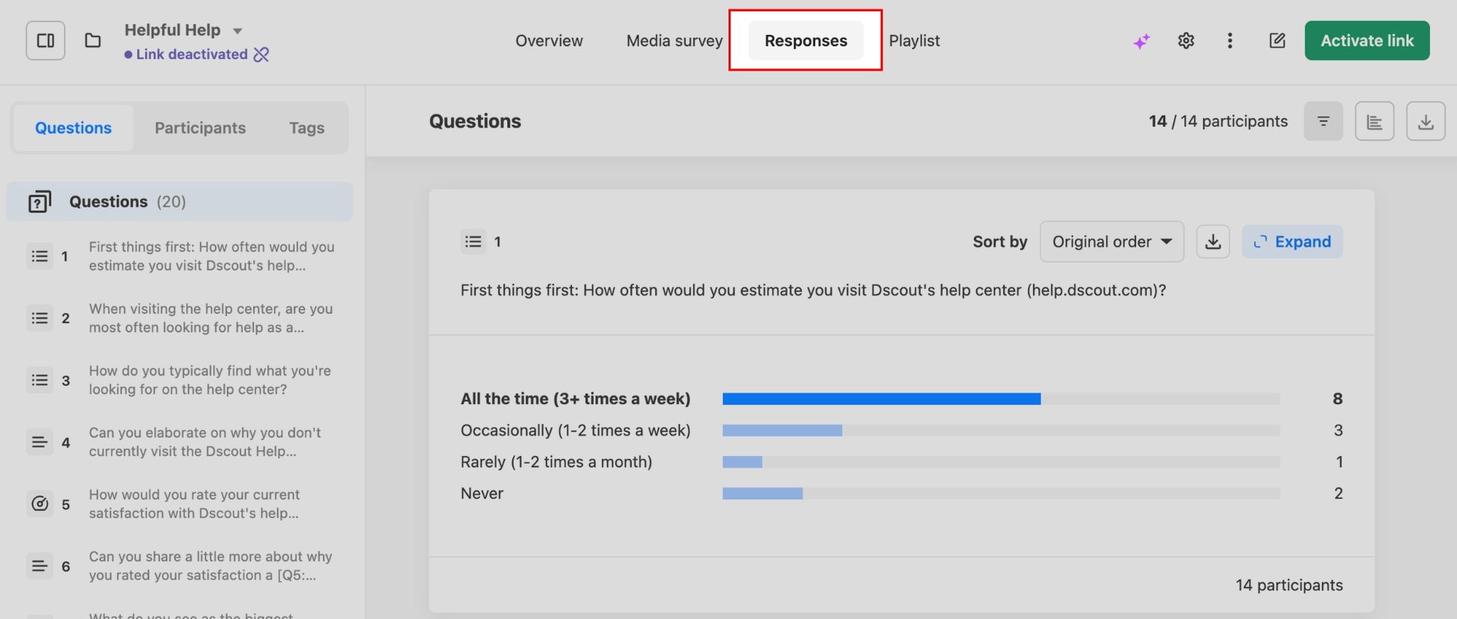 When participants start submitting responses to your media survey, you can view them on the Responses tab of your study.