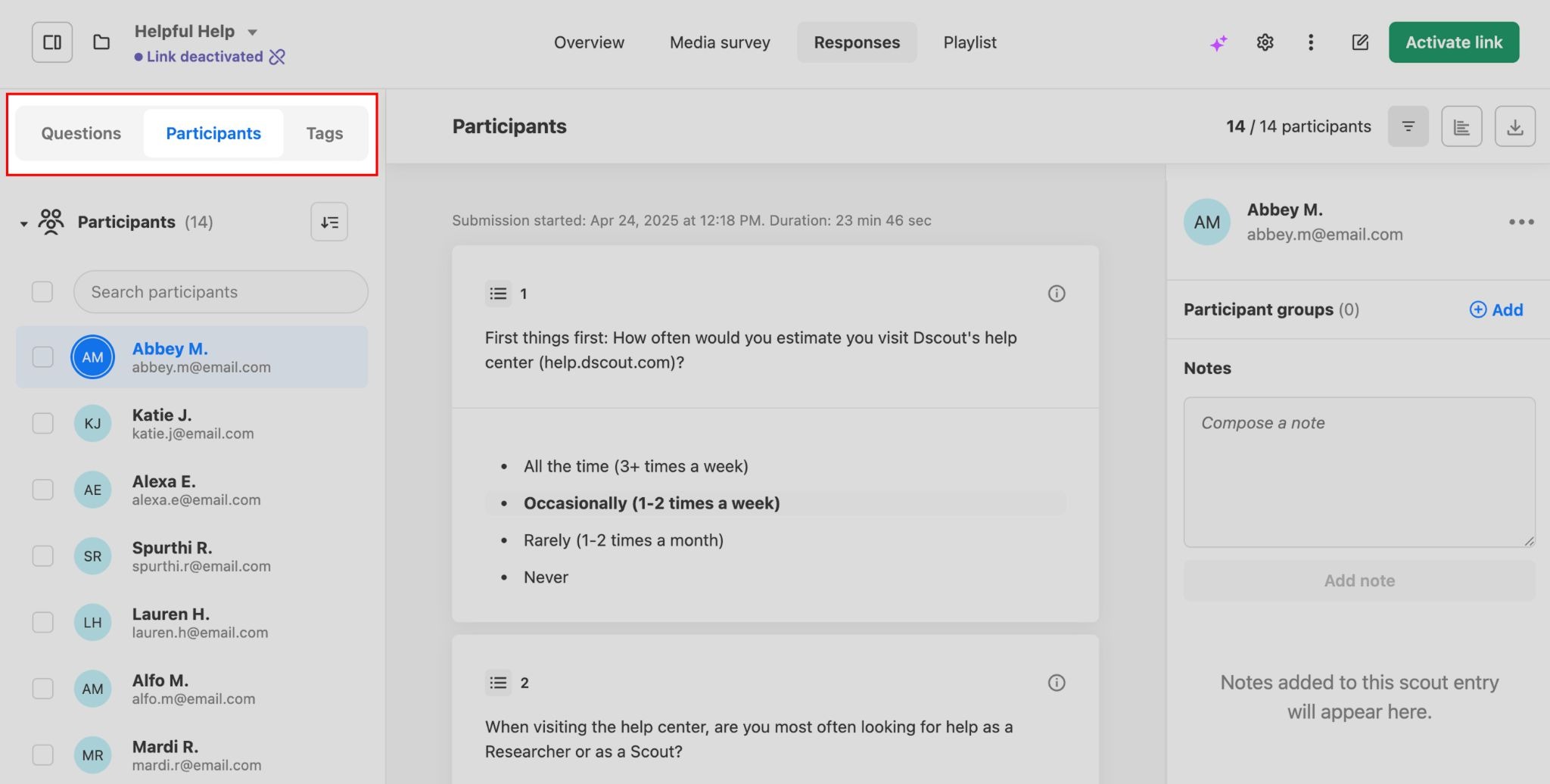 To view responses from individual participants, open the Participants tab in the left sidebar. Then, select a participant: