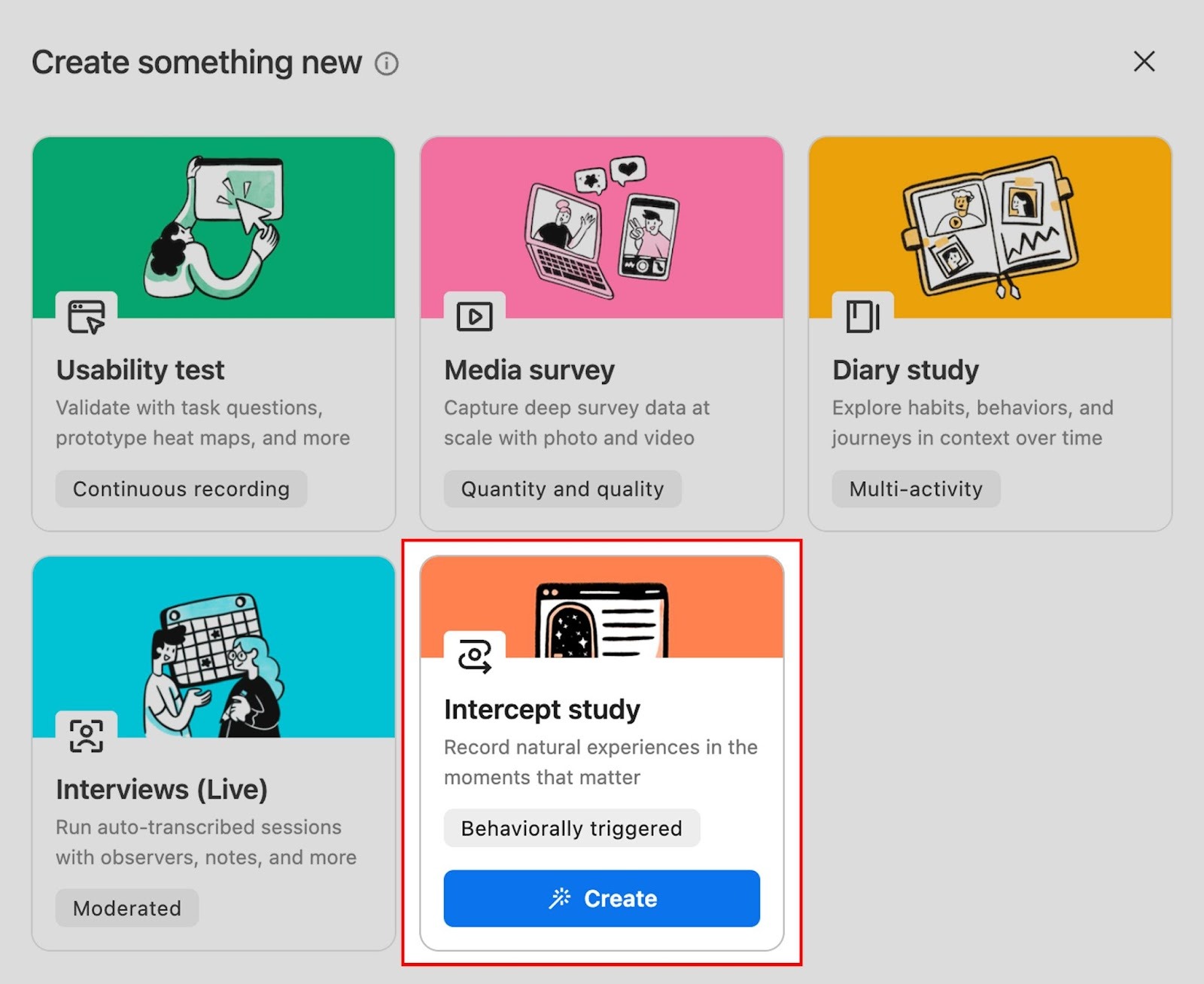 If you want to create a new intercept study from scratch—or if you’re building one for the first time—you’ll do so from within your Dscout project.