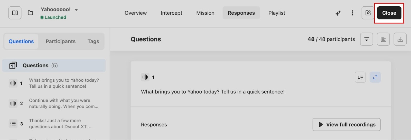 When you no longer want to receive new responses to your study, you can close it. Closing an intercept study prevents it from being displayed to new participants. (Participants who have already started their submissions will still be able to finish.)