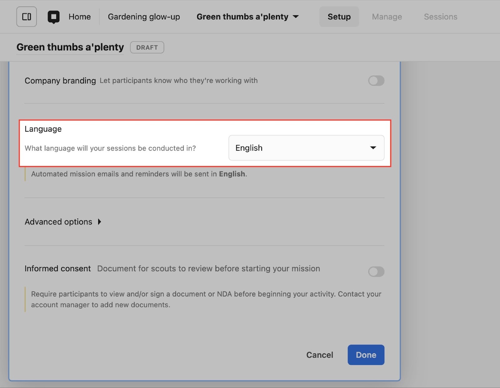 Note: You cannot change the language of your study once it’s launched. Be sure you’ve selected your desired language before you open it to participants.