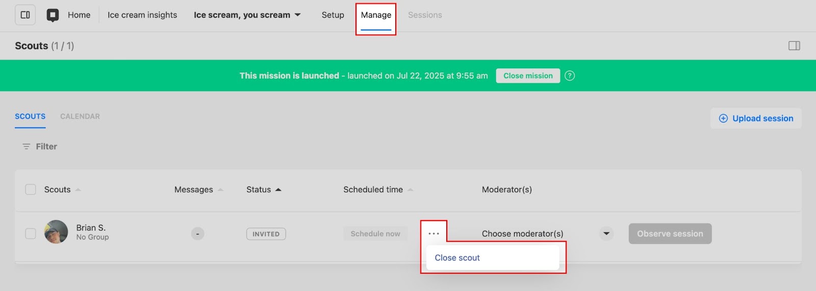 To prevent participants from scheduling further interview sessions, you can “close” them on the Manage tab of your study.