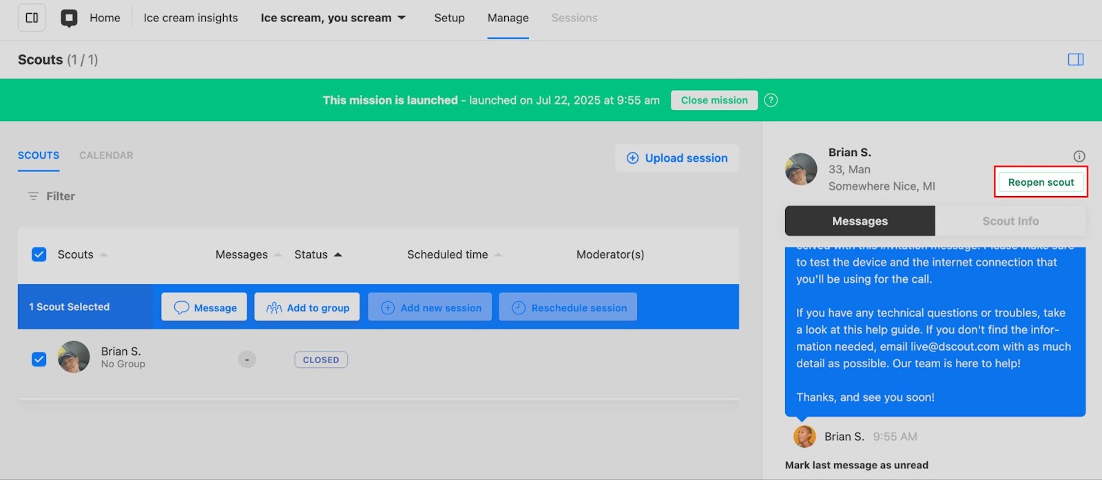 - Click Reopen scout in the messaging sidebar. A confirmation modal is displayed.
