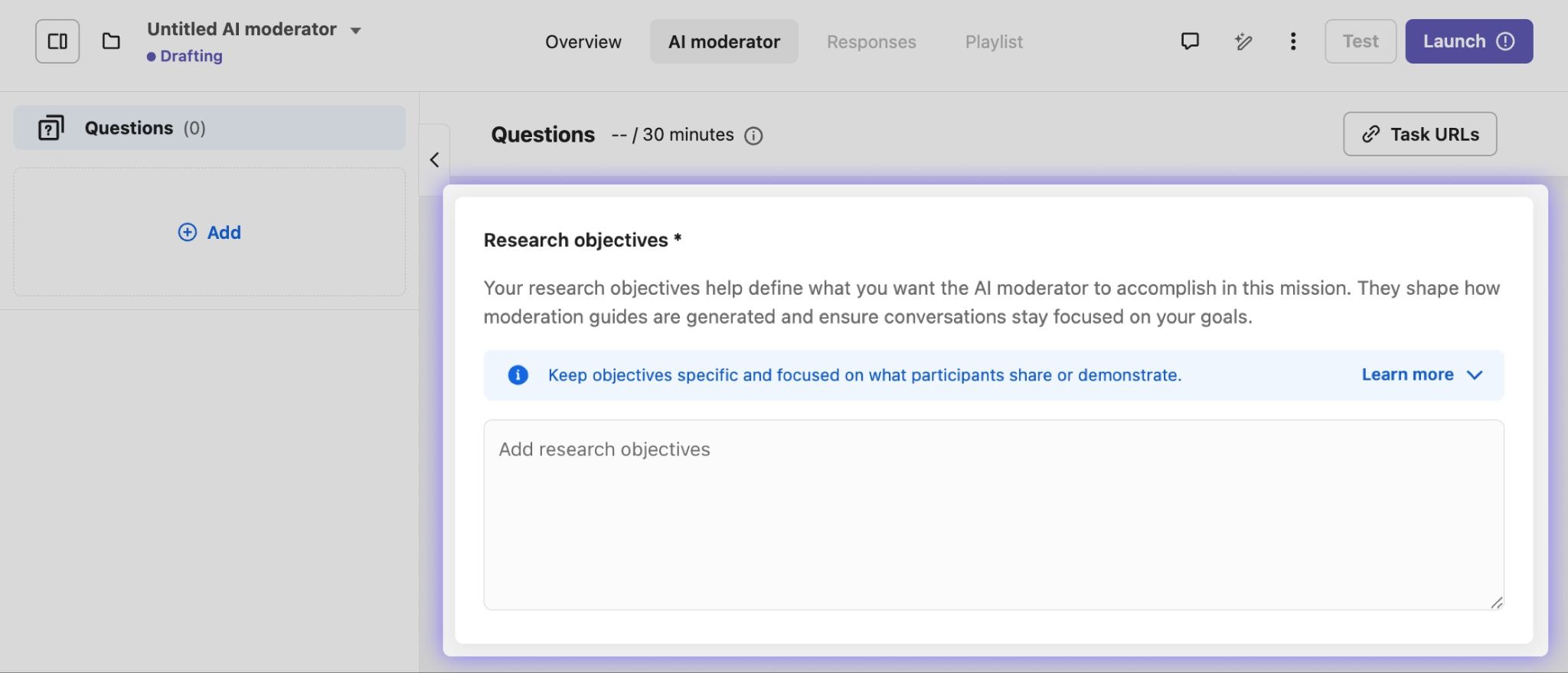 Once you’ve defined your research objectives, you’ll add your study questions on the AI moderator tab.