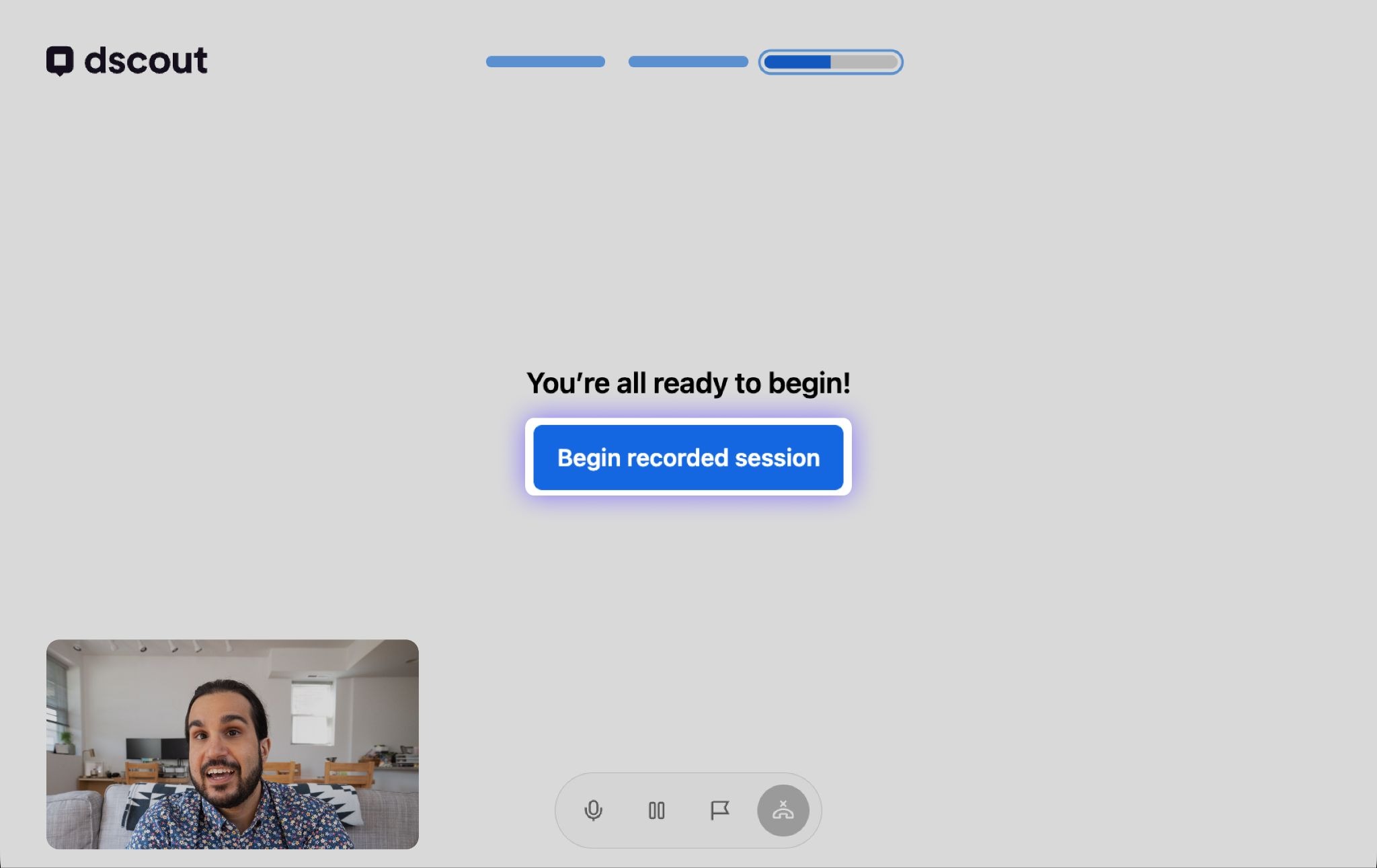 As they progress through the study, bars at the top of the page indicate the participant’s position. And at the bottom of the page, a control bar lets them mute their microphone, pause the session, flag a concerning moment, or end the session: