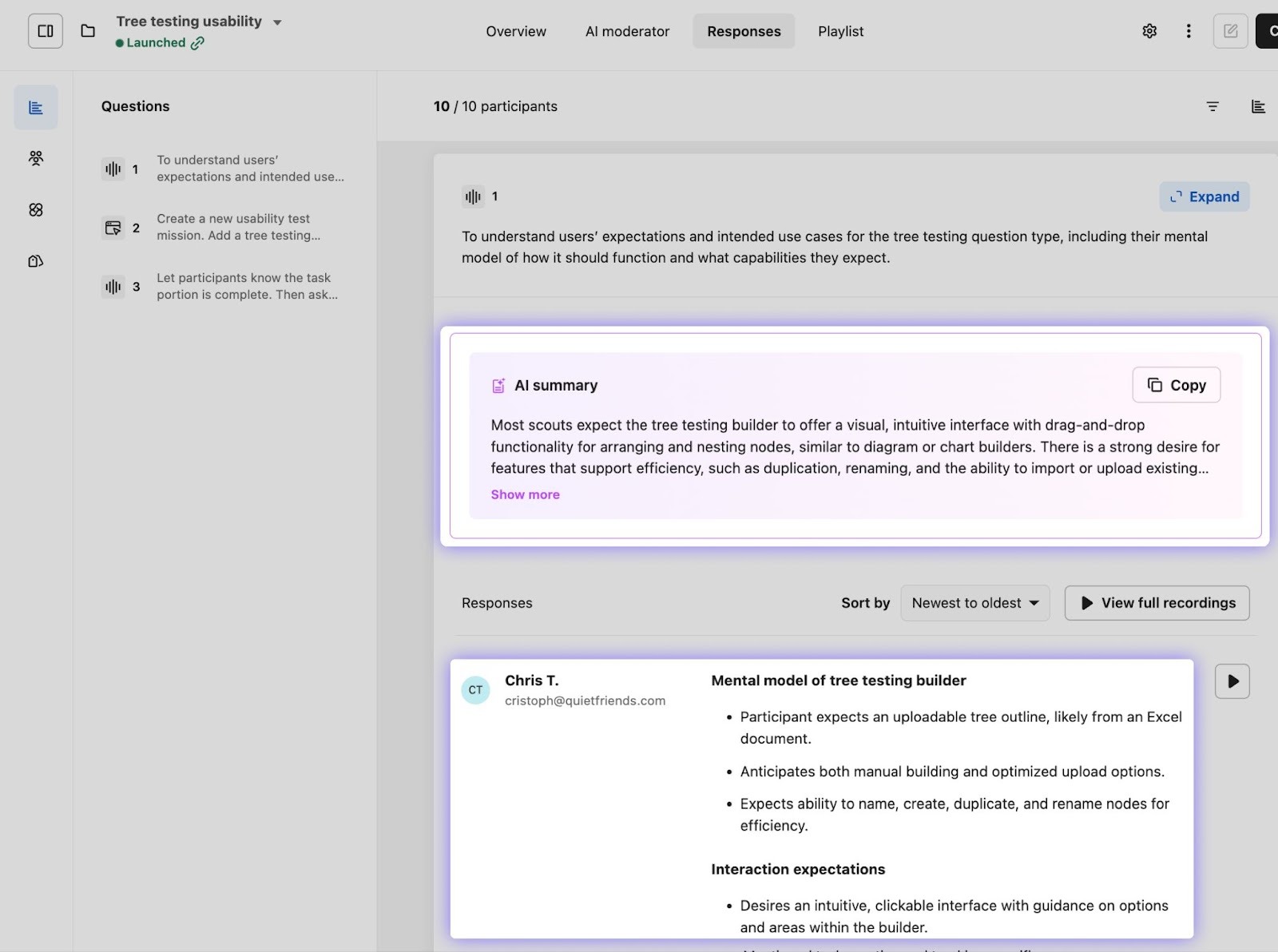 For each open-ended question, you’ll find an AI-generated summary drawn from all participant responses as well as summaries generated for each individual participant: