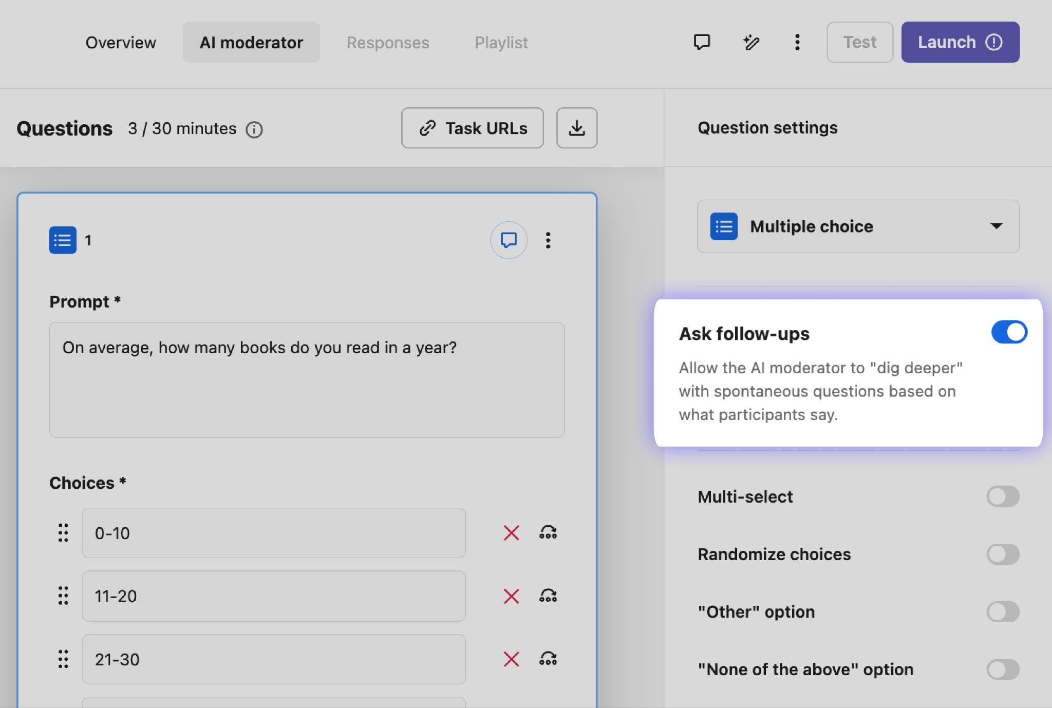For example, with Ask follow-ups enabled, the AI moderator can dig deeper to understand why a participant chose a certain value on a scale question or why they made a certain selection on a multiple choice question.