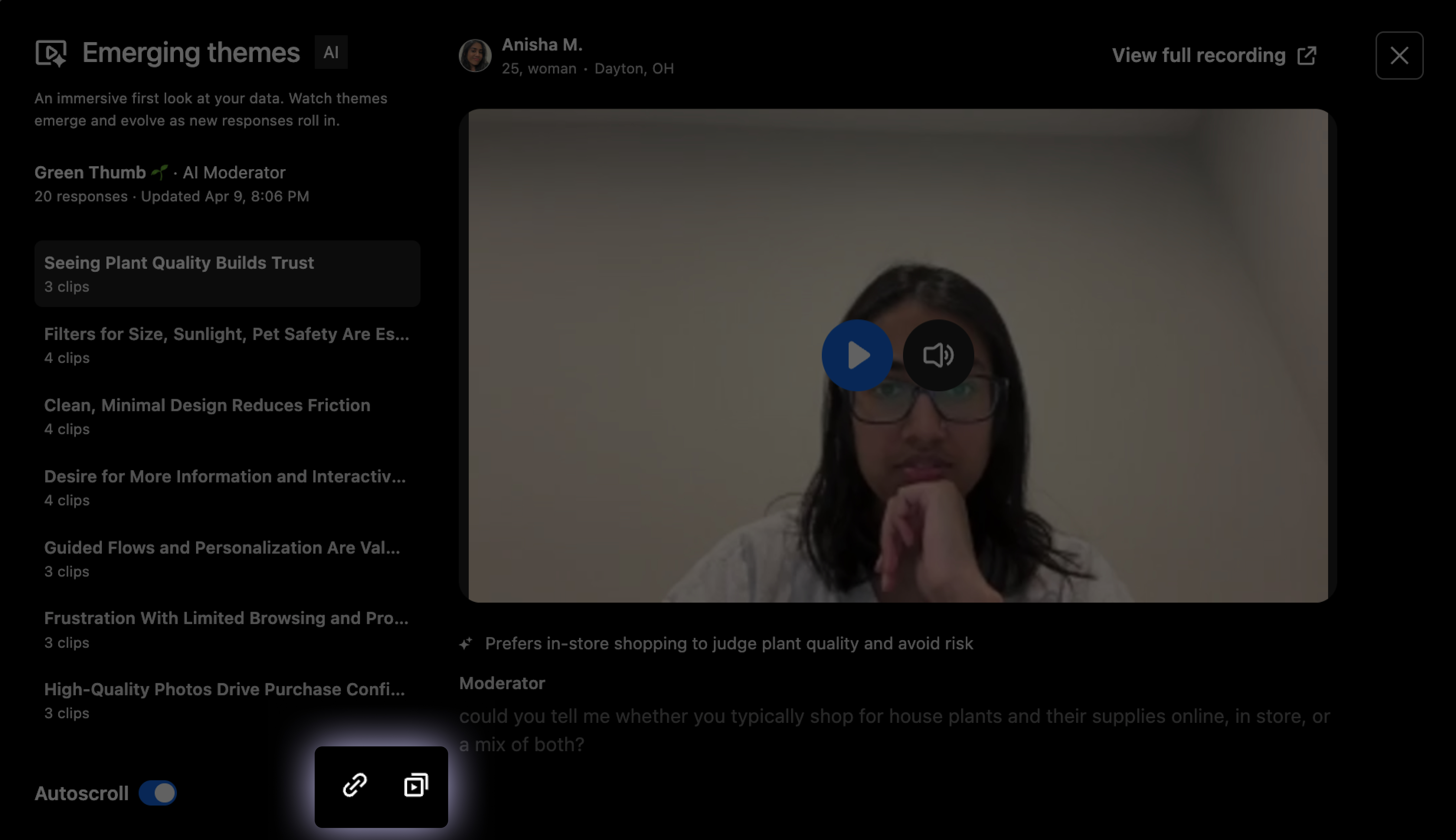 In the modal, select a theme from the list to view a playlist of supporting clips from real participant responses: