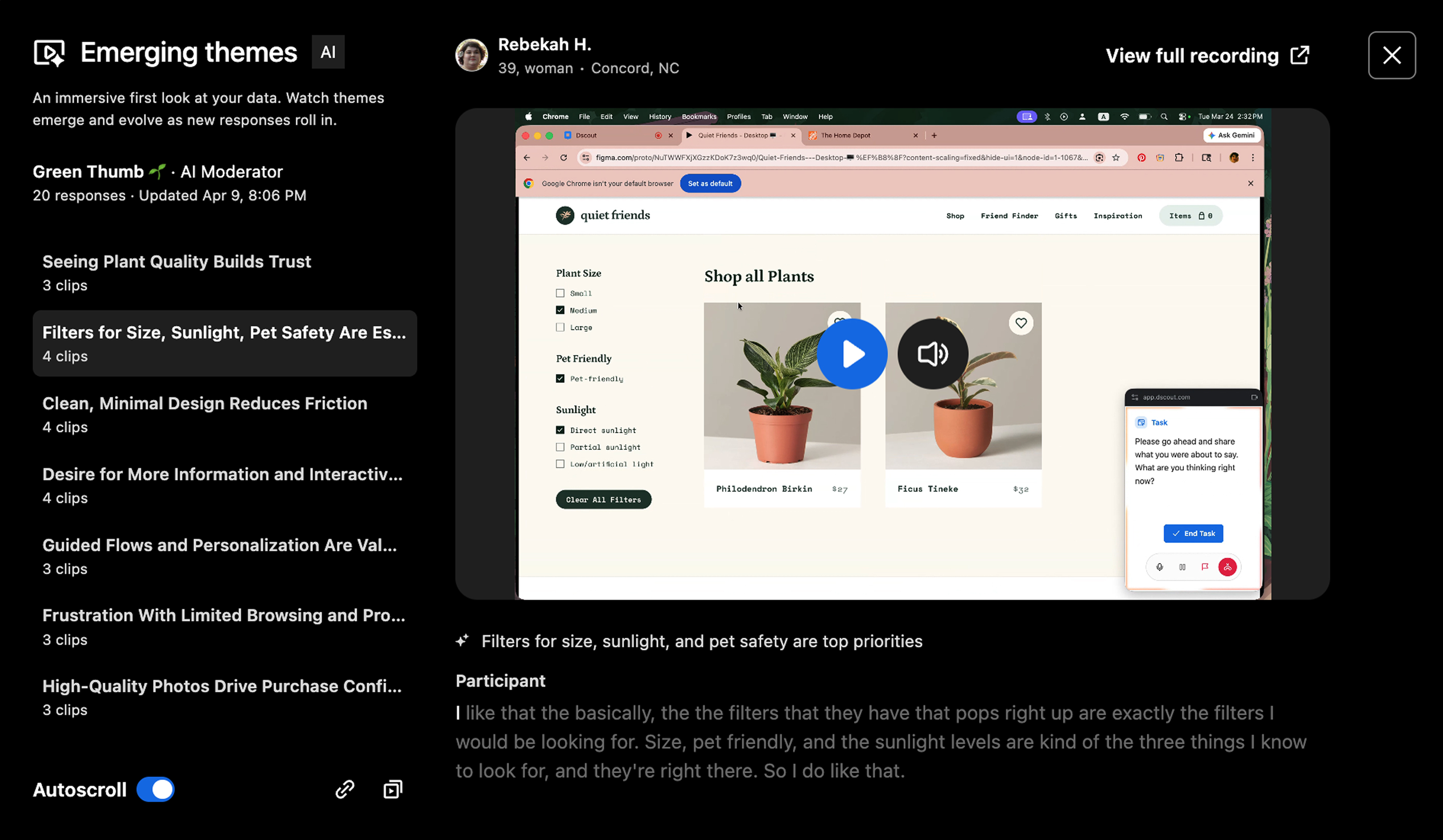 To view the entire transcript from a participant’s responses, navigate to their full session recording.