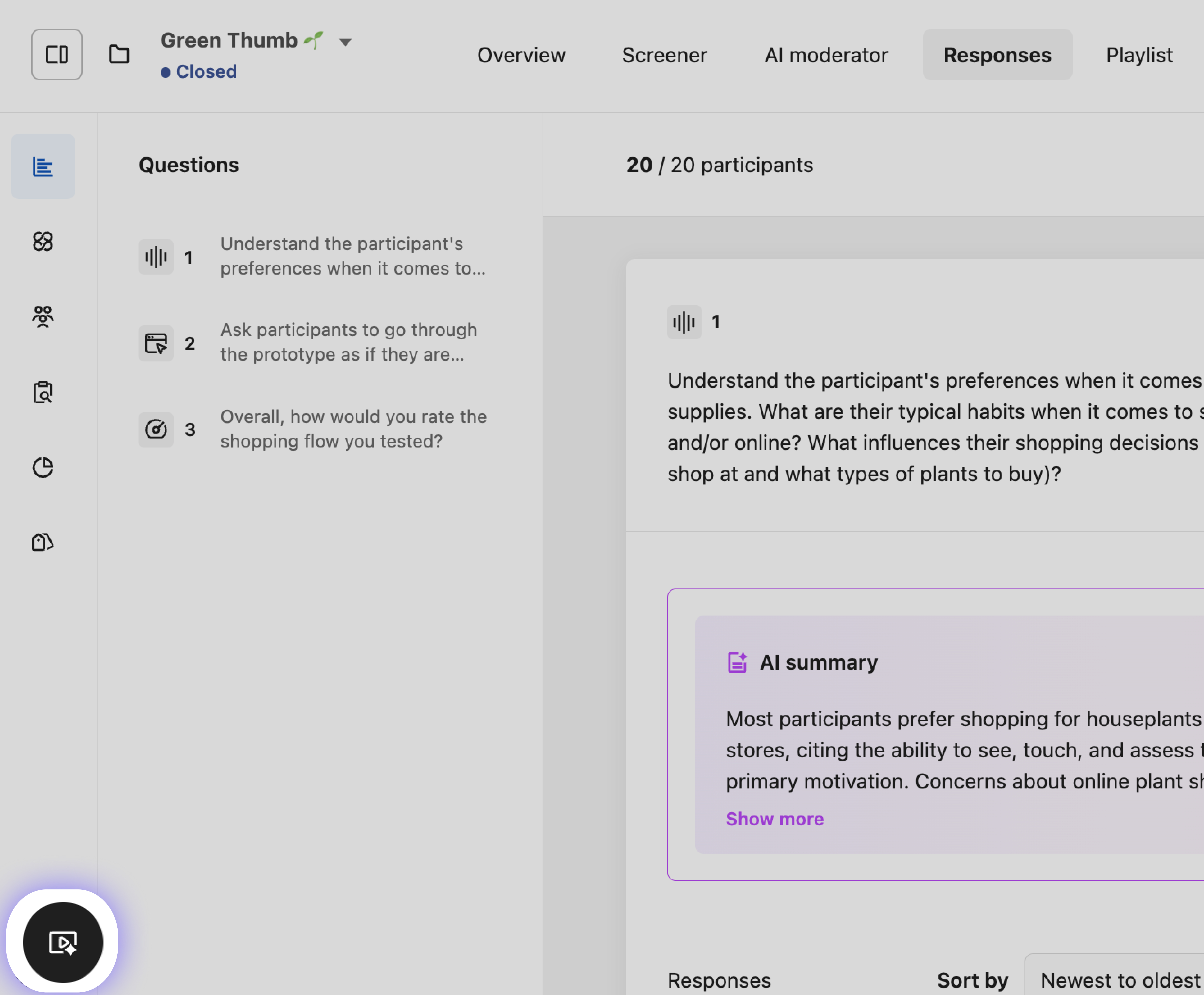 The emerging themes modal opens the first time you access the Responses tab of your study. You can also access it again later by clicking the icon in the bottom left corner of the page: