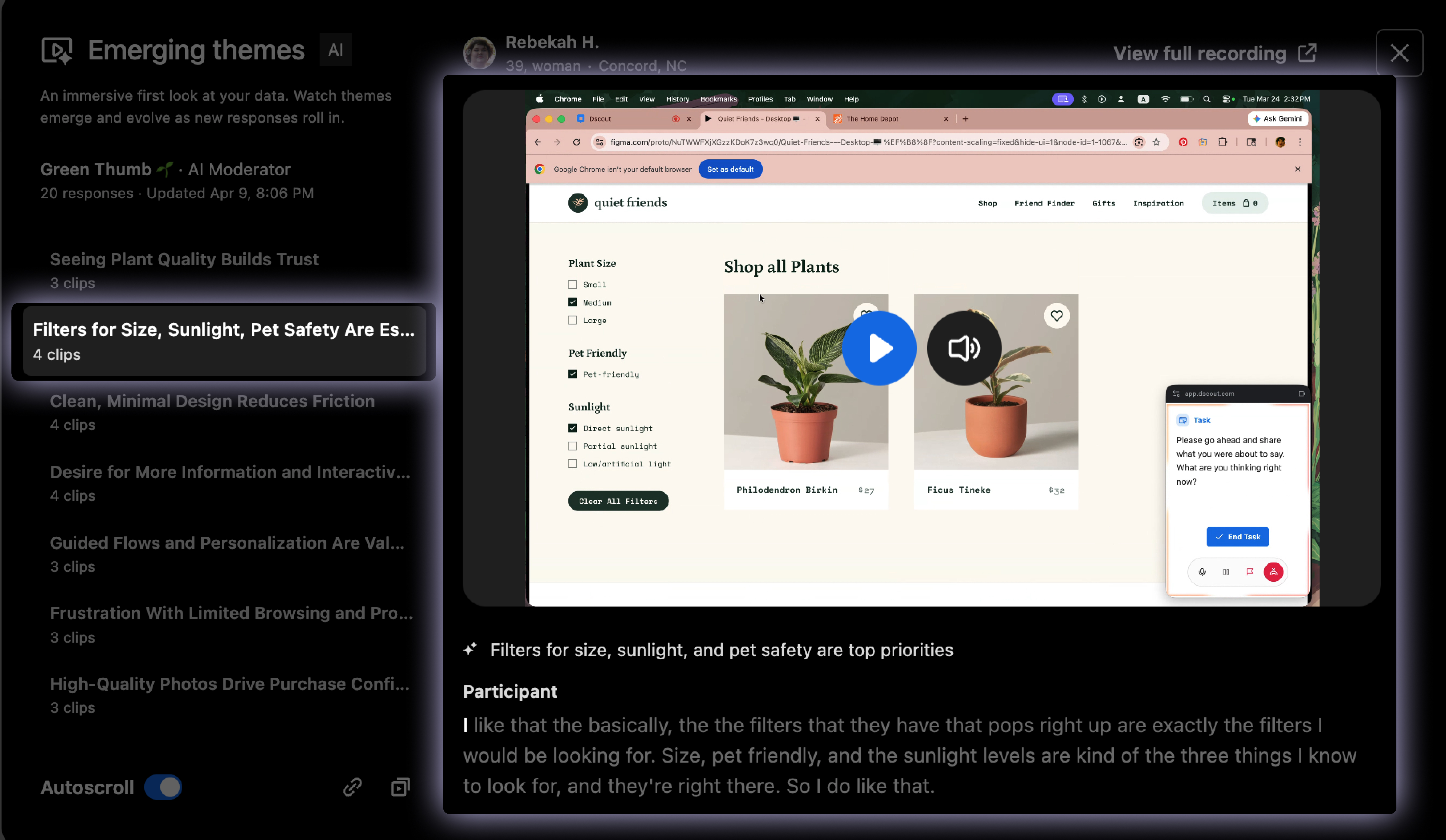 AI moderated studies collect interview-depth responses at scale. But how do you review those responses at a speed to match? Dscout AI helps by surfacing emerging themes in automatic playlists that update with new clips as responses roll in. Themes are identified using your research objectives as inspiration as well as comments or topics that arise across participants.